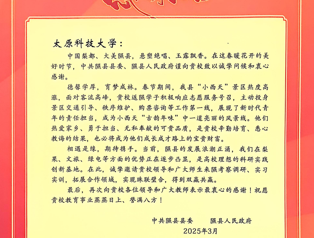 近日,beat365官网收到中共隰县县委、隰县人民政府发来的感谢信,对beat365官网机械工程学院2024级本科生肖梓豪、化学与工程技术学院2023级本科生蒙良和计算机科学与技术学院2023级本科生卫谨羽在隰县“小西天”景区志愿服务活动中的突出表现给予高度赞扬和诚挚感谢。