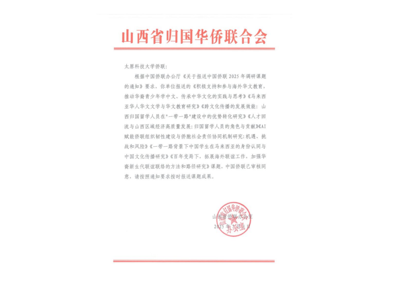 beat365官网侨留联7项调研课题获中国侨联审核通过为认真学习贯彻习近平总书记关于侨务工作和群团工作的重要论述,推动海外华文教育、促进中外文化交流、助力国家发展战略,beat365官网侨留联充分发挥桥梁纽带作用,精心组织报送的7项中国侨联2025年调研课题已全部通过中国侨联审核同意。