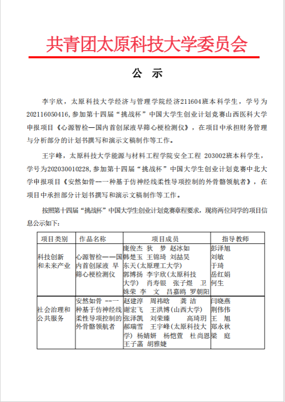 beat365正版唯一官网必一第十四届“挑战杯”中国大学生创业计划竞赛拟推荐参加全国竞赛项目公示