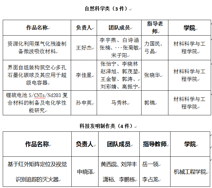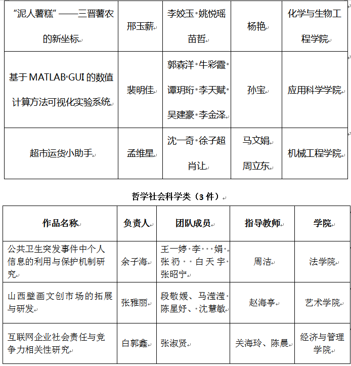 按照《关于组织开展山西省第十七届“兴晋挑战杯”大学生课外学术科技作品竞赛beat365正版唯一官网必一校级赛事的通知》,校内17位专家经过3月30日—4月1日的紧张评审,评选出beat365官网晋级省赛的10件作品,现将作品名单公示如下: