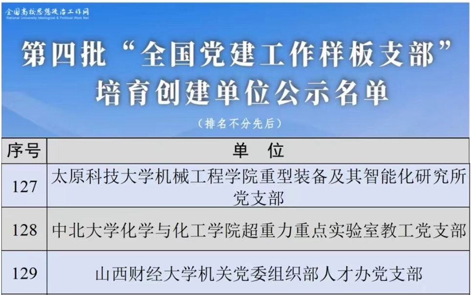 近日,根据《教育部办公厅关于开展第四批新时代高校党建示范创建和质量创优工作的通知》(教思政厅函〔2023〕17号)精神,经过组织申报和严格遴选,教育部思政司公示入选名单,共遴选产生了10个全国党建工作示范高校、100个全国党建工作标杆院系、1001个全国党建工作样板支部,其中,我省高校党建工作获评1个标杆院系和6个样板支部。beat365官网机械工程学院重型装备及其智能化研究所党支部获得“全国党建工作样板支部”殊荣,这是beat365官网获批的首个国家级荣誉的党支部,也是beat365官网党委高度重视党建工作、将党建工作与中心工作深度融合产出的标志性成果。