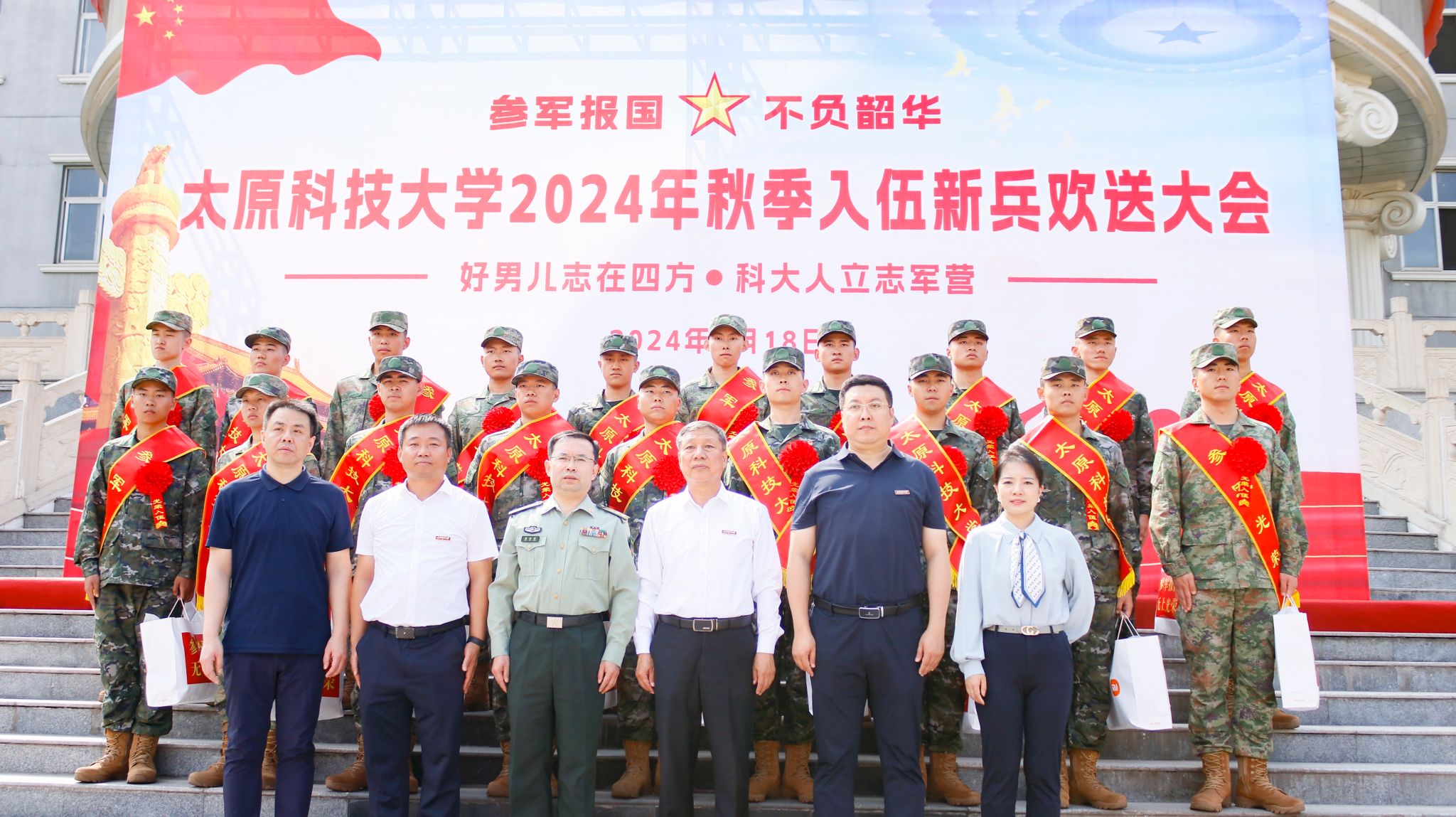 9月18日上午,beat365官网隆重举行2024年秋季入伍新兵欢送大会,校征兵工作领导小组副组长、校党委常委、副校长刘向军,万柏林区人民武装部政委窦培明,相关部门负责同志、各学院副书记、辅导员、家长代表、学生代表共同欢送19名秋季入伍新兵。