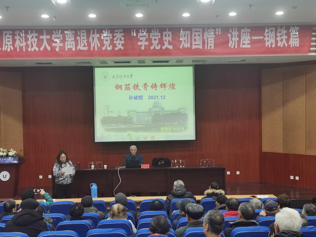 为了让离退休职工更深入地了解我国钢铁发展史,充分感受国家发展的艰难曲折,感受中华人民共和国成立以来钢铁工业发展取得的成绩艰辛不易,了解现代钢铁工业发展的趋势,离退休党委于12月14日下午3点在图书馆六层报告厅举办了“学党史 知国情”系列报告之---“钢筋铁骨铸辉煌”讲座,全体在职党员、80余名离退休人员参加了报告会,会议由离退休党委书记王慧霖同志主持。