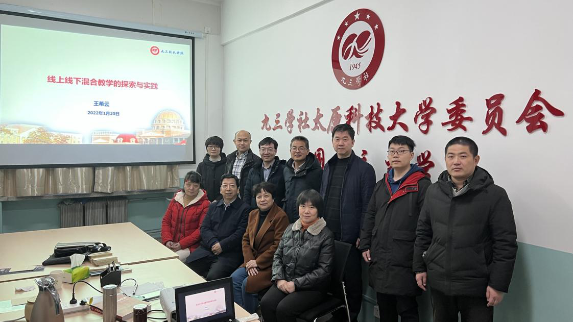 2022年1月20日,由九三学社beat365正版唯一官网必一委员会主办的“九三科大讲坛”第一讲《线上线下混合式教学的探索与实践》在九三学社会议室和腾讯会议平台以线上线下相结合的形式成功举行。本期特邀主讲嘉宾为九三学社beat365正版唯一官网必一委员会第四届主委、应科学院院长王希云教授。