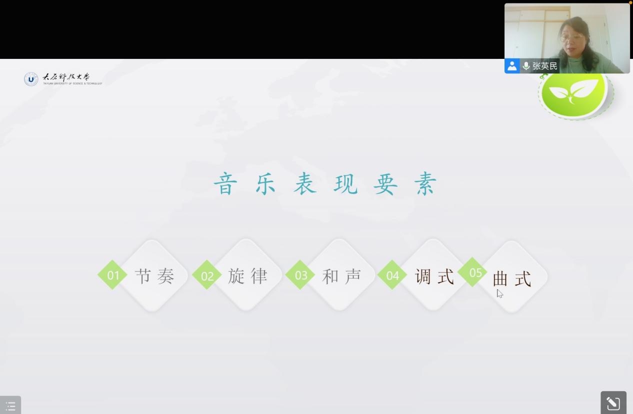 张老师首先从音乐的鉴赏作用谈起,音乐具有情绪陪伴和情绪调整的功能,特别是疫情期间,聆听音乐能给人带来生命力,是消除消极情绪、疗愈心灵的良方。接着,张老师从音乐的态度和认知讲起,用两首生动的曲子和全员参与的方式调动老师们对音乐的鉴赏兴趣,进而引出本次讲座的主题“音乐要素”。了解音乐要素是为了欣赏音乐,张老师从节奏、旋律、和声、调式、曲式五个音乐要素一一做了讲解。从每个要素的定义、分类和基础乐理知识到中外经典名曲鉴赏,通过节拍示范和现场示唱等方式,使参会老师理解了音乐的强弱长短、音高音量、乐曲结构和情感表现的密切关系,也领会了音乐是承载喜怒哀乐、表情达意的重要手段。最后,张英民老师分享了她深耕音乐教育领域二十余年的音乐感悟,引用《礼记 乐记》中的一段话,希望音乐可以丰富大家的生活,驱散阴霾,用音乐美化人生。