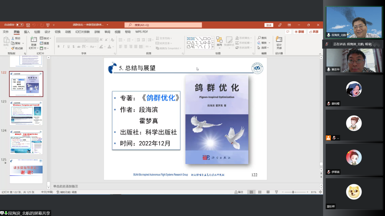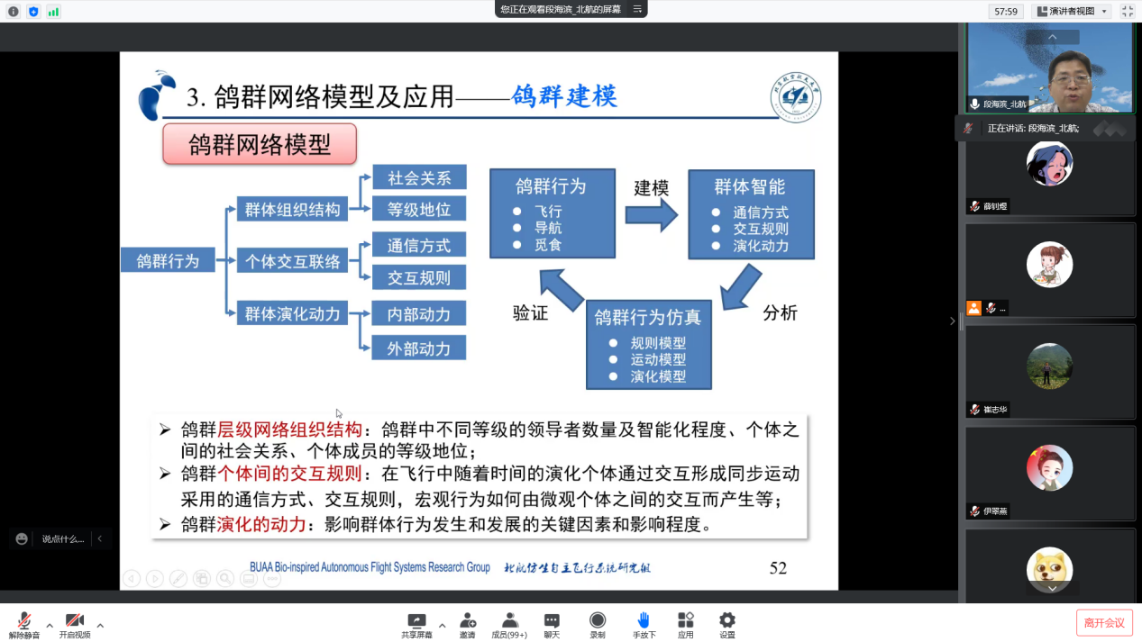 本次报告段教授从生物群体智能、鸽群智能行为、鸽群网格模型及应用、鸽群智能优化及应用等方面对鸽群优化进行了详细的介绍。以自然界中的鸽群、鹰群、雁群、布谷鸟群等鸟类随机运动、群集觅食等行为为切入点,阐述了典型鸽群所具有的智能行为和鸽群网络机理,进而引入本次报告的“主角”——鸽群优化,并介绍了鸽群研究的最新进展和典型应用。报告最后,段教授对鸽群优化的未来发展趋势进行了展望。讲座结束后,在线师生进行了热烈的讨论。