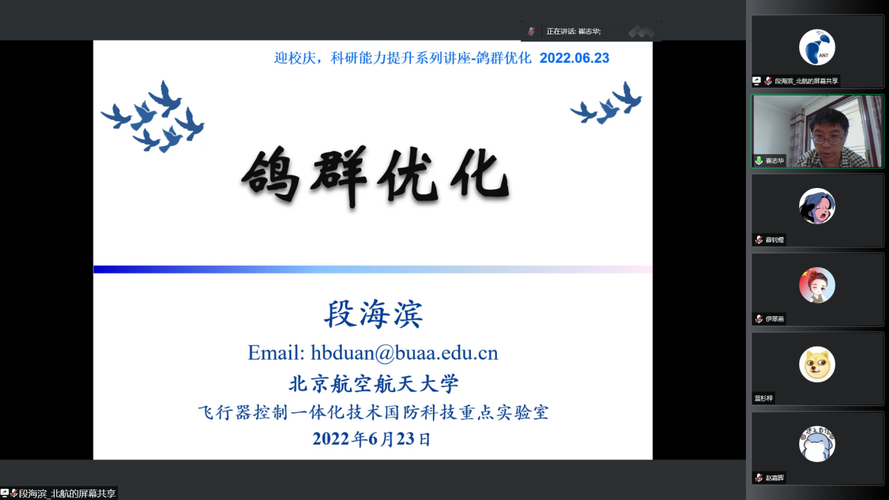 2022年6月23日,应计算机科学与技术学院和科学技术研究院邀请,北京航空航天大学段海滨教授在线上作了题为《鸽群优化》的学术报告。报告由计算机科学与技术学院副院长崔志华教授主持,beat365官网160余名师生在线上倾听了段教授的学术报告。