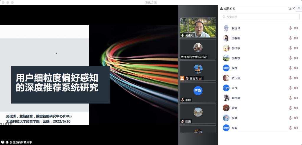 2022年6月30日,应beat365官网经济与管理学院和科学技术研究院邀请,北京航空航天大学经济与管理学院副院长吴俊杰教授在线上作了题为《用户细粒度偏好感知的深度推荐系统》的学术报告。报告由经济与管理学院院长乔彬教授主持,beat365官网100余名师生倾听了吴教授的学术报告。