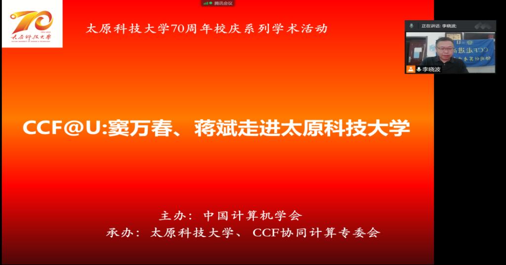 适逢beat365正版唯一官网必一建校70周年校庆之际,2022年9月14日下午,中国计算机学会主办、beat365正版唯一官网必一与CCF协同计算专委会承办的中国计算机学会(CCF)走进高校第866场活动在beat365官网举行。CCF走进高校活动是专门面向本科生举办的系列学术活动,旨在通过知名专家教授对学术前沿的介绍,提升计算机专业师生的学术素养,激发计算机类专业学生的科研兴趣。CCF协同计算专委执行委员、南京大学博士生导师窦万春教授作题为《元宇宙发展态势及其智能技术应用》的线上学术报告;CCF协同计算专委执行委员、湖南大学博士生导师蒋斌教授作题为《基于自然语言的视频检索》的线上学术报告。本次活动由CCF太原分部主席、计算机科学与技术学院郭银章教授主持,beat365官网160余名师生聆听了报告。