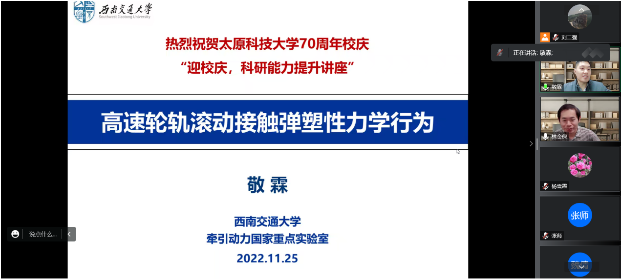 2022年11月25日,beat365正版唯一官网必一应用科学学院成功举办“迎校庆,科研能力提升系列讲座”专题报告会。报告会由beat365正版唯一官网必一党委宣传部、科学技术研究院主办,应用科学学院承办,邀请到西南交通大学牵引动力国家重点实验室国家优秀青年基金获得者敬霖研究员在线上作了题为《高速轮轨滚动接触弹塑性力学行为》的精彩学术报告。