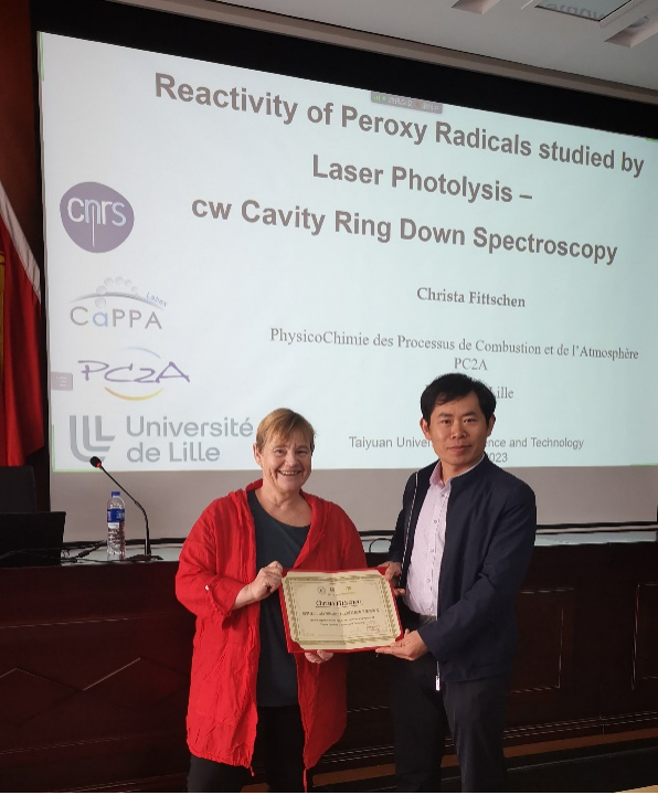 2023年4月27日,法国国家科学研究中心和里尔大学“燃烧过程和大气的物理化学实验室(PC2A)”的研究主任Christa Fittschen教授和爱尔兰科克大学化学研究中心Andy Ruth教授应邀在图书馆六楼作了两场精彩学术报告。报告会由beat365正版唯一官网必一党委宣传部、科学技术研究院主办、应用科学学院承办,光学工程学科教师及研究生聆听了报告会。应用科学学院李传亮教授主持了本次学术报告。做报告前,应用科学学院院长林金保教授为Fittsche教授授予了beat365正版唯一官网必一荣誉教授称号。随后,李传亮教授代表学院师生对与会专家表示真挚的感谢,并邀请与会专家及其团队今后来beat365官网进行深入的学术交流,为学科发展和人才培养进行指导。