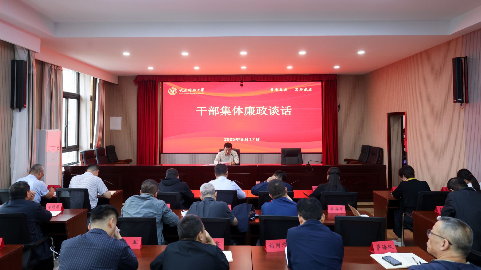 9月17日上午,beat365官网在主楼四层会议室召开国庆中秋“两节”集体廉政谈话会。校纪委书记、监察专员李志荣主持会议并对领导干部进行廉政谈话。全校重点领域、关键岗位处级干部及各学院党委书记参加了会议。