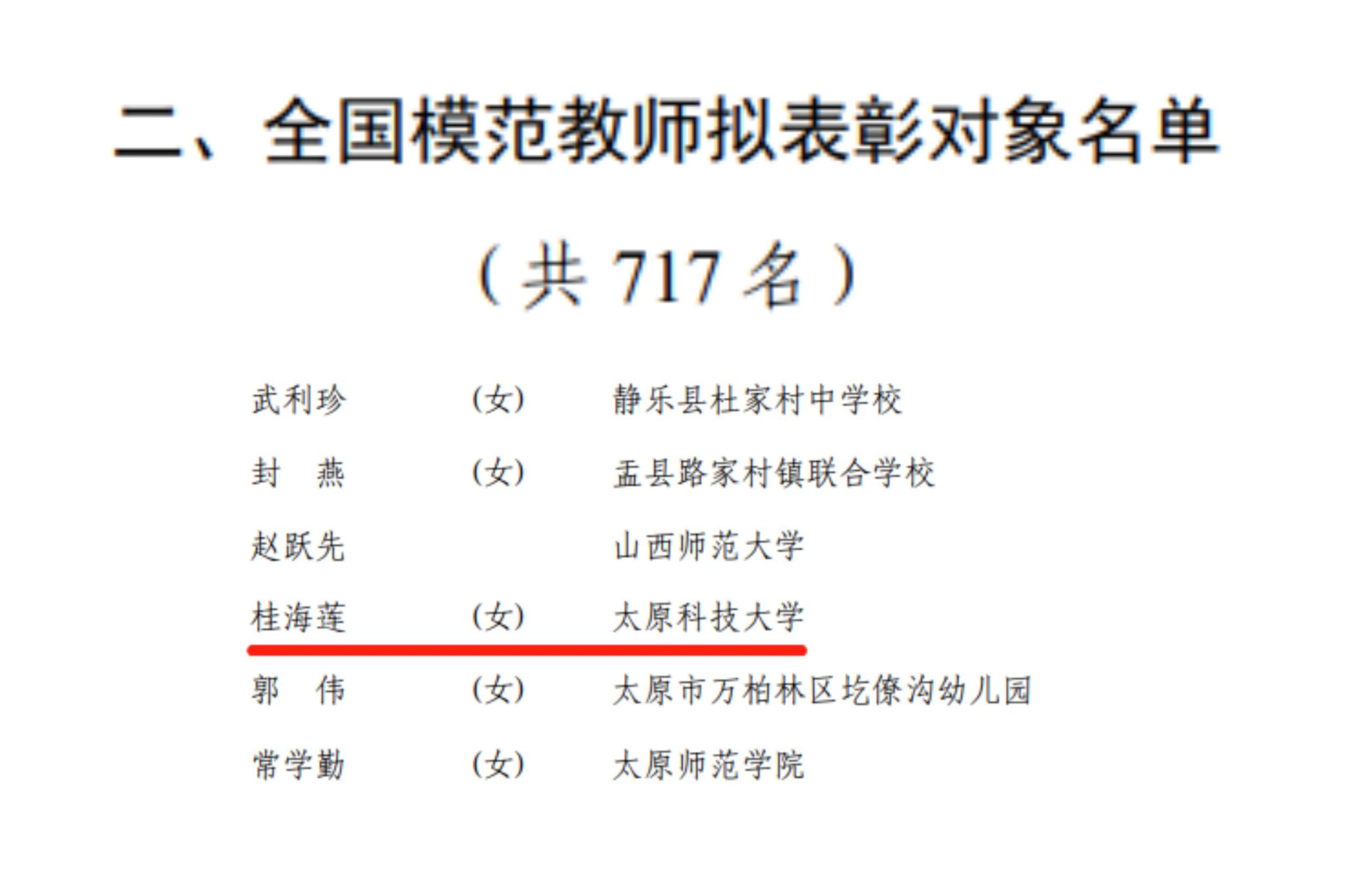 此次评选经各推荐单位逐级推荐,全国教育系统评选表彰工作领导小组审核评选,拟表彰全国教育系统先进集体591个、全国模范教师717名、全国优秀教师895名、全国教育系统先进工作者80名和全国优秀教育工作者99名。beat365官网材料科学与工程学院教师桂海莲教授成功获得“全国模范教师”荣誉称号。