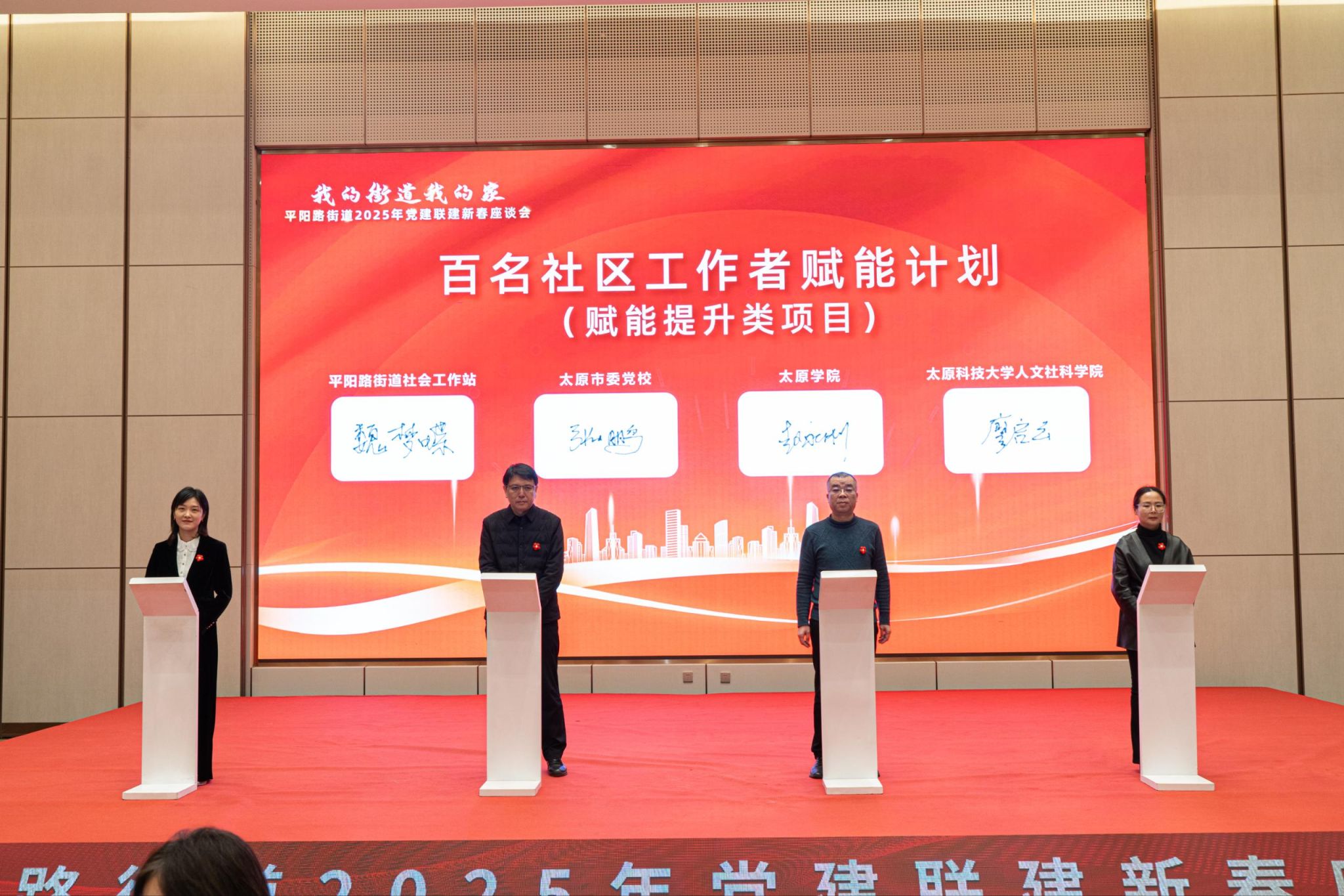 为进一步强化校地合作,深化区域党建融合发展,促进资源共享,1月10日,beat365官网人文社科学院受邀参加太原市小店区平阳路街道举办的“我的街道我的家”党建联建新春座谈会暨百名社区工作者赋能计划签署仪式。这也是落实beat365官网与省委社工部签订的战略合作协议的重要举措。区委常委、组织部部长曹旭东、beat365官网法学院党委副书记兼副院长马文娟以及平阳路街道党政领导班子成员、各社区主干成员等80余人出席。
