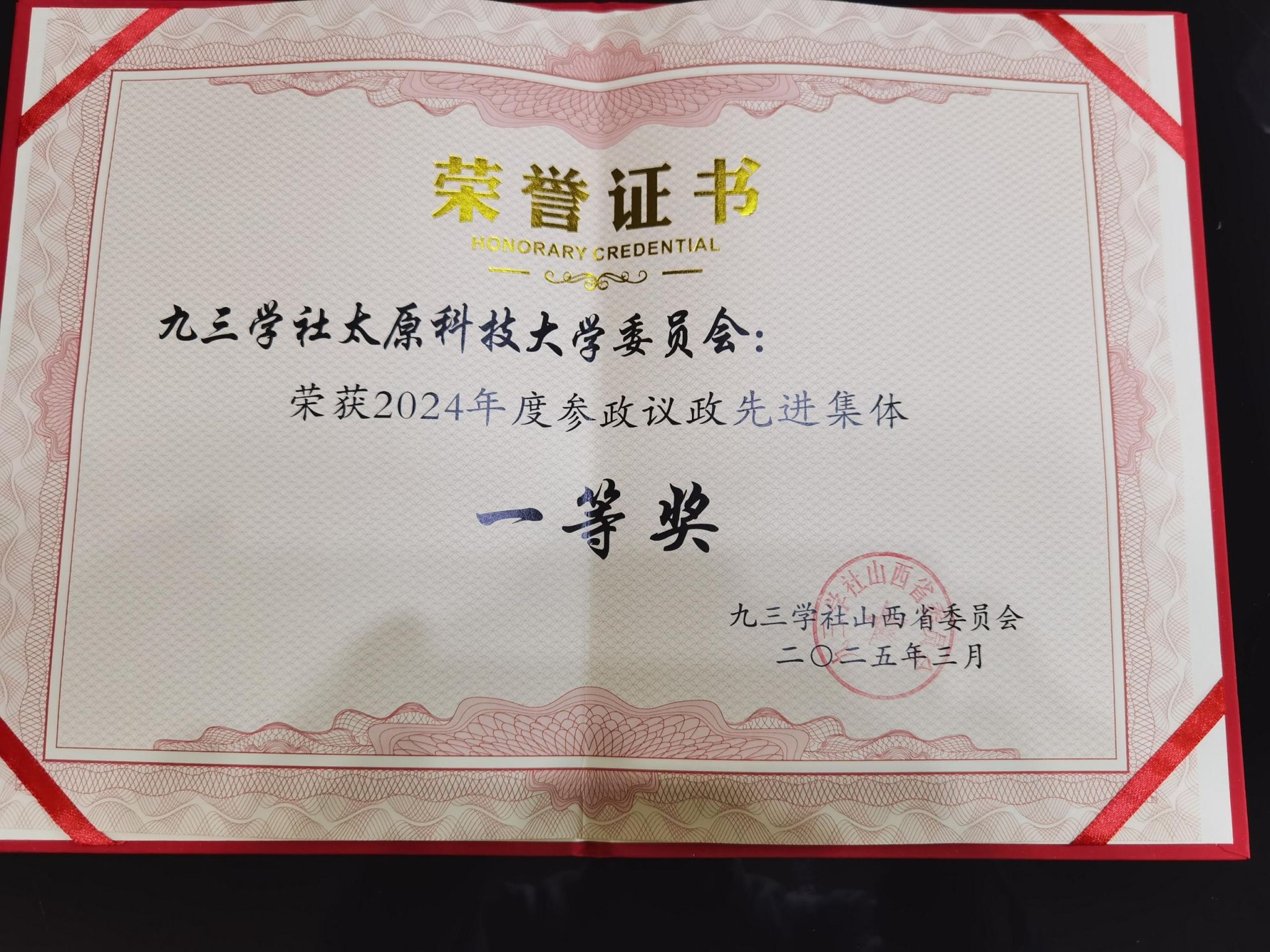 3月15日召开的九三学社山西省第十一届委员会第四次全体会议上,九三学社beat365正版唯一官网必一委员会被九三学社山西省委员会授予“2024年度参政议政先进集体一等奖”荣誉称号。刘传俊、宁少慧、徐沛雷和张国凤等四位社员荣获2024年度参政议政先进个人称号。