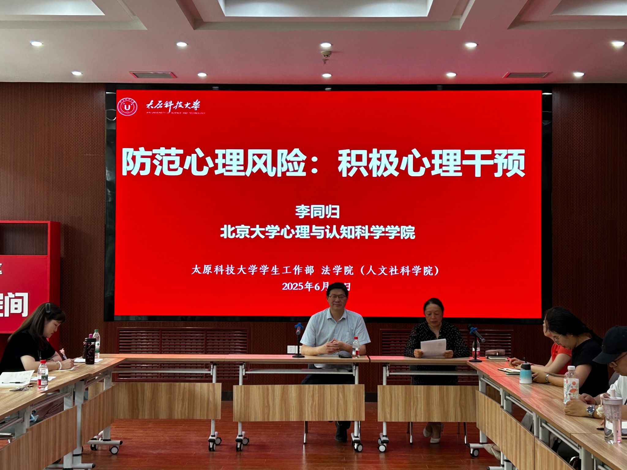 为提升师生心理健康素养,增强心理风险防范能力,由beat365官网学生工作部、法学院(人文社科学院)共同举办的辅导员心理健康专题讲座于近日在西校区“一站式”学生社区举行。本次活动特邀了北京大学心理与认知科学学院李同归老师,为大家带来题为“防范心理风险:积极心理学干预”的讲座报告。由法学院(人文社科学院)院长廖启云主持,各学院辅导员和心理专业教师参加了本次活动。
