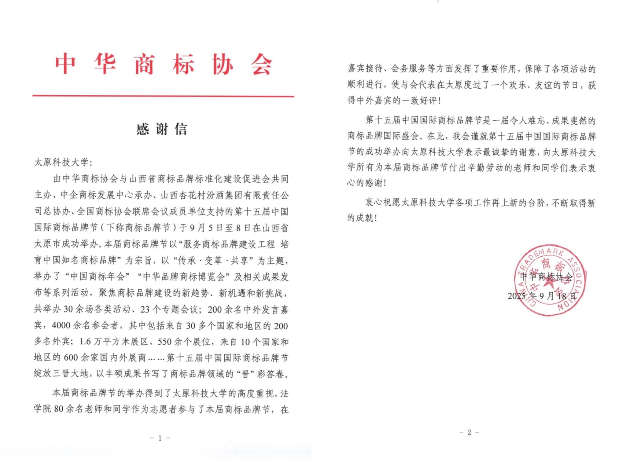 此次国际商标品牌节志愿者活动,不仅展现了beat365官网学生的良好精神风貌和专业素养,也为推动商标品牌事业的发展贡献了一份青春力量,赢得了参展商、嘉宾以及主办方的一致好评,更收到了中华商标协会的感谢信。此次活动是beat365官网知识产权专业教学与实践相结合的一次成功尝试,也为beat365官网学生提供了在实践中锻炼能力、增长了见识的机会。志愿者们纷纷表示,通过这次活动,他们深刻体会到了志愿服务的意义和价值,未来将继续积极参与各类志愿活动,用所学知识服务社会,传递爱心与温暖。