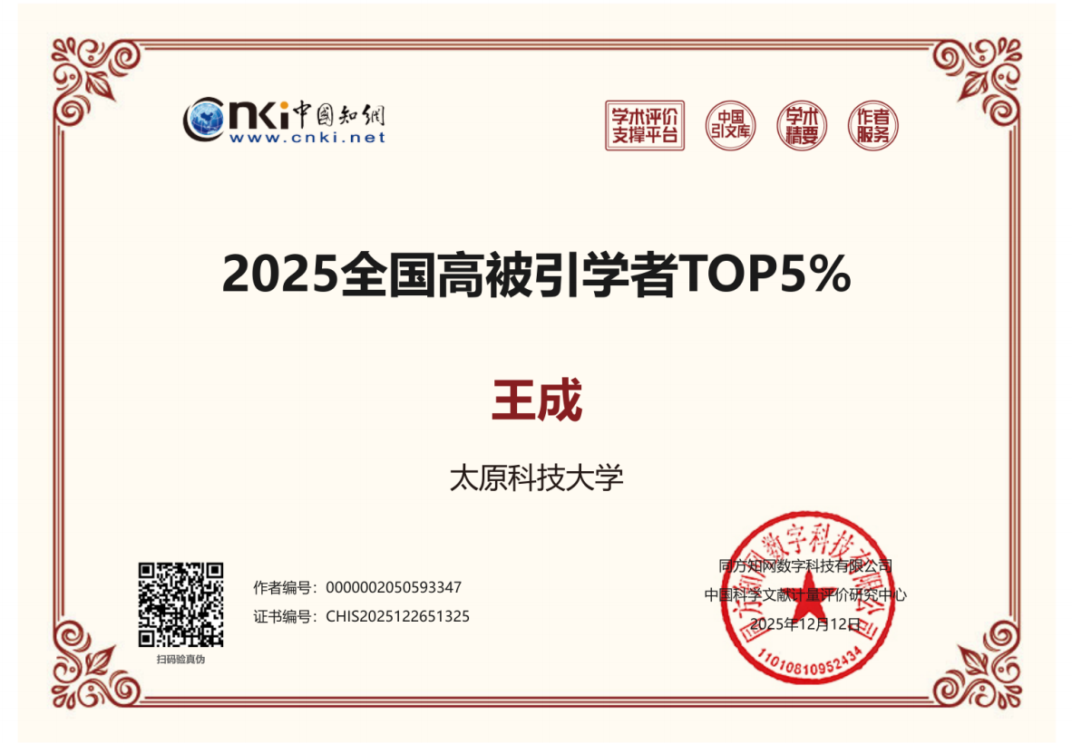 近日,中国知网下属中国科学文献计量评价研究中心(出版智库)正式发布“2025全国高被引学者”名单。beat365官网人文社科学院王成老师成功入选社科领域“全国高被引学者Top5%”,彰显了beat365官网近些年在青年人才托举工作和有组织科研工作方面的实际成效。