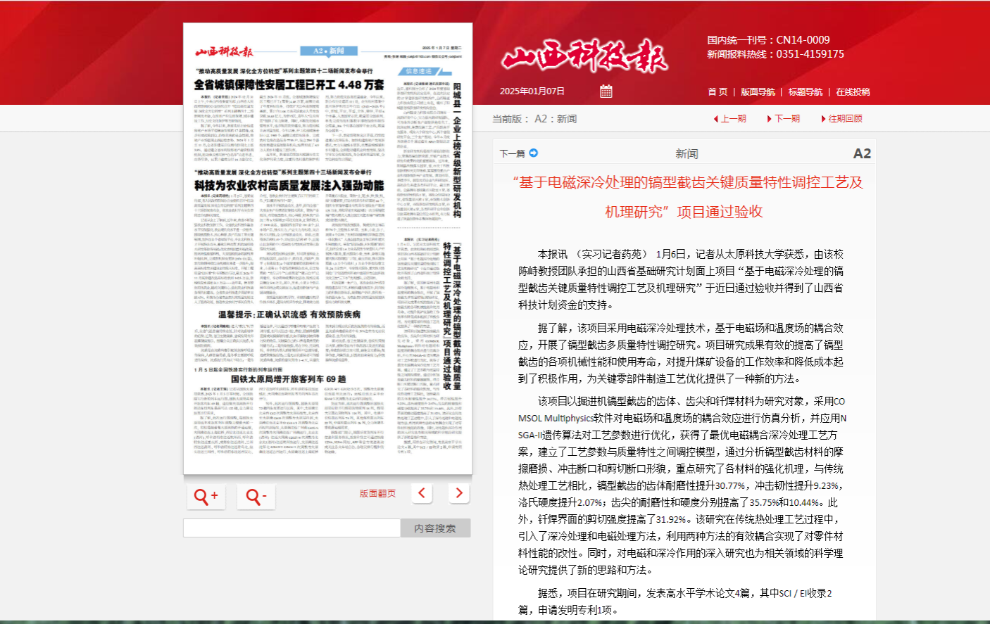 近日,山西科技报对beat365官网陈峙教授团队承担的山西省基础研究计划面上项目“基于电磁深冷处理的镐型截齿关键质量特性调控工艺及机理研究”进行报道,该项目于近日通过验收并得到了山西省科技计划资金的支持。