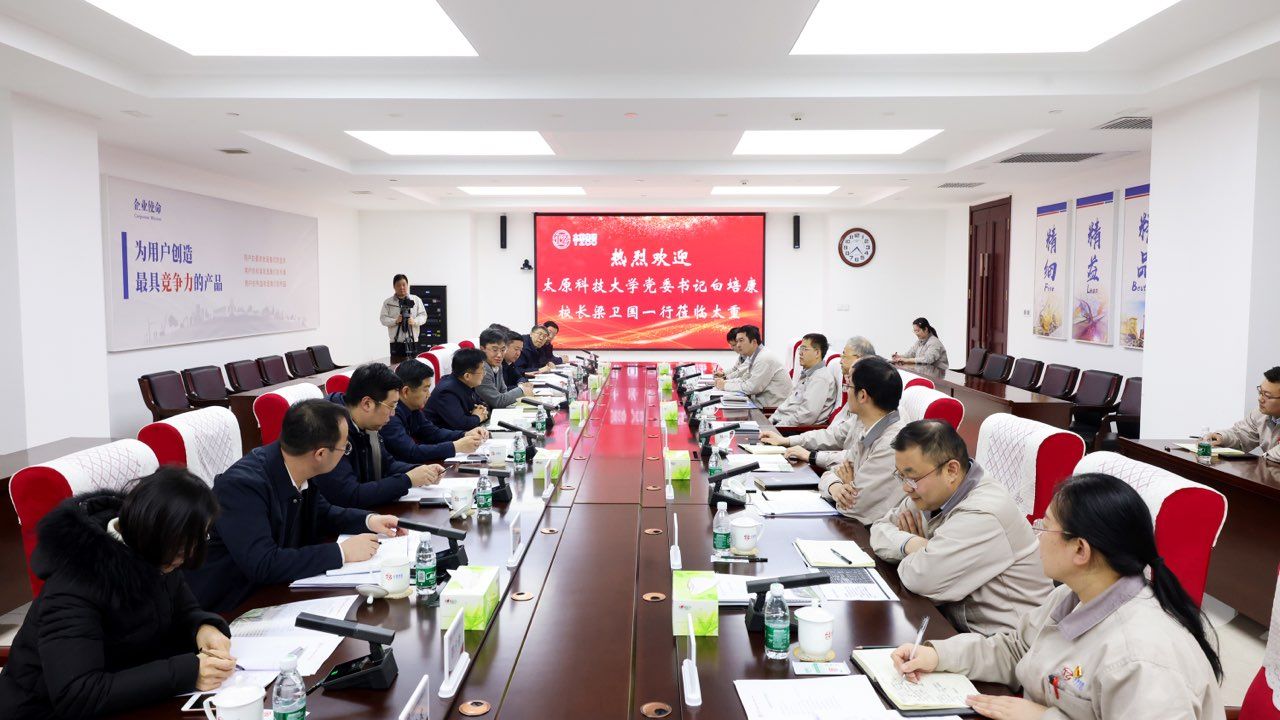 2月18日下午,校党委书记白培康,校党委副书记、校长梁卫国,副校长谢刚带队前往太原重型机械集团有限公司调研交流并座谈。集团公司党委书记、董事长韩珍堂,党委常委、副总经理史智杰,总经济师苏伟中及相关单位负责人出席座谈会。