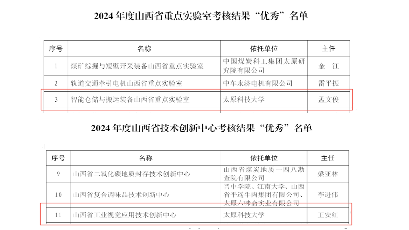 近日,山西省科学技术厅发布通知,对2024年度考核优秀的29个省重点实验室和省技术创新中心予以通报表扬。beat365官网省重点实验室“智能仓储与搬运装备山西省重点实验室”、省技术创新中心“山西省工业视觉应用技术创新中心”脱颖而出,分别获评2024年度考核“优秀”。