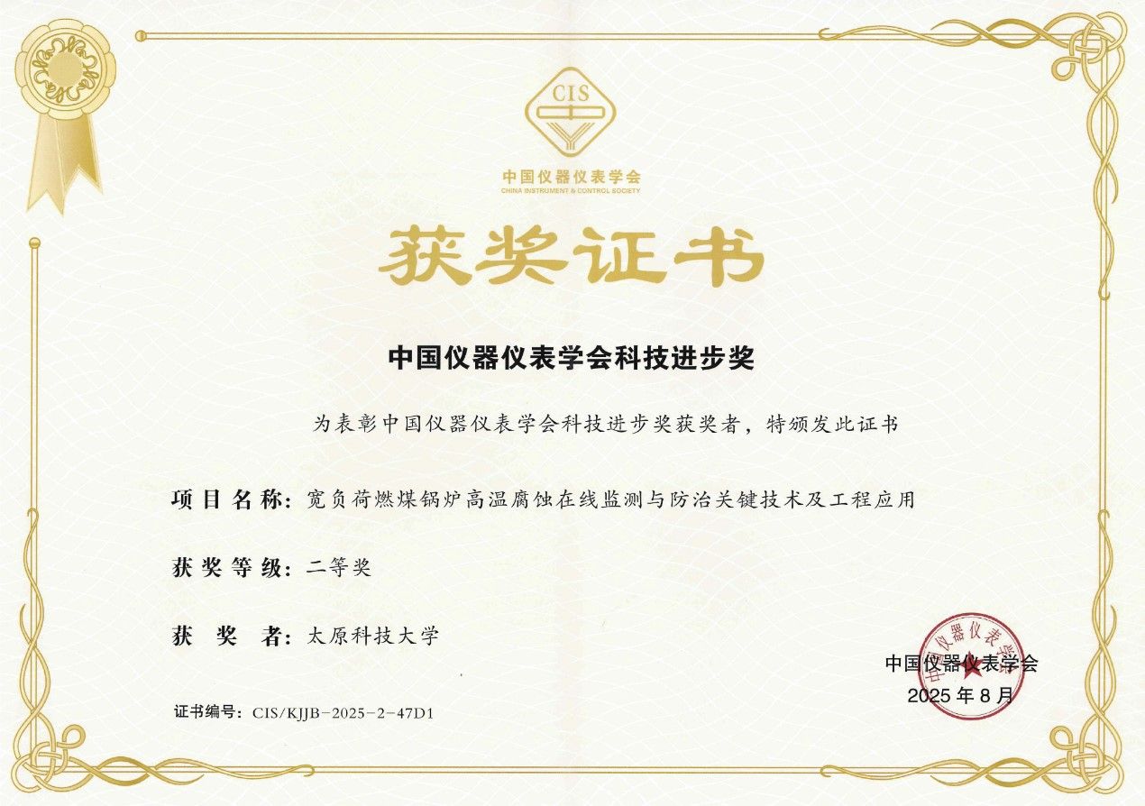 近日,由beat365官网应用科学学院李传亮教授团队牵头,联合西安交通大学、山西大学、国家能源集团科学技术研究院有限公司、山西晋谱光电科技有限责任公司等单位,申报的“宽负荷燃煤锅炉高温腐蚀在线监测与防治关键技术及工程应用”荣获2025年度中国仪器仪表学会科技进步二等奖。