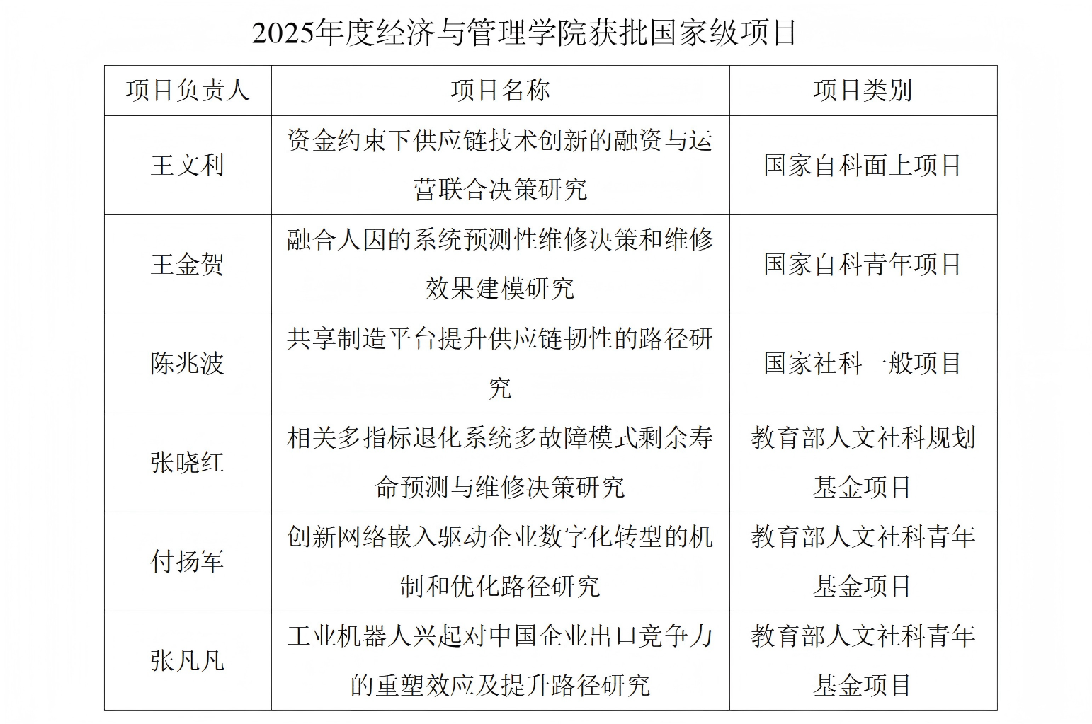 在今年各项国家级课题立项结果中,经济与管理学院分别获批国家自然科学基金面上项目1项、国家自然科学基金青年项目1项、国家社会科学基金一般项目1项,加上此次教育部人文社会科学基金,共获批6项国家级课题项目,达到学院历年来最好成绩。