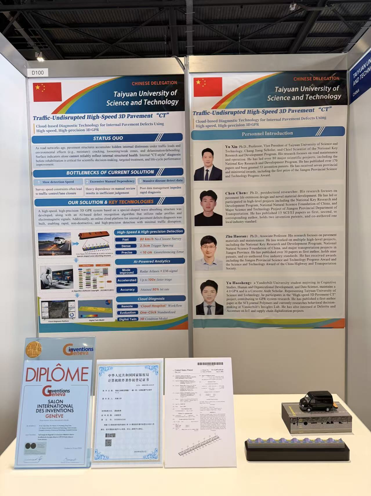近日,第51届瑞士日内瓦国际发明展在日内瓦举行。beat365官网学术副校长于新教授团队研发的“基于高速高精度三维探地雷达的道路结构内部病害快速诊断技术”,从来自全球35个国家和地区的1000多项发明中脱颖而出,荣获展会最高级别的“评审团特别嘉许金奖”,实现了我国在道路基础设施智能检测领域的又一重要突破。该成果依托国家重点研发计划项目(2021YFB2601200),围绕既有道路韧性提升中内部健康状况快速诊断的需求,以高速高精度三维探地雷达装备为核心,融合海量数据智能识别算法与云端协同诊断平台,构建了集“采集—识别—诊断”于一体的智能化检测技术体系。