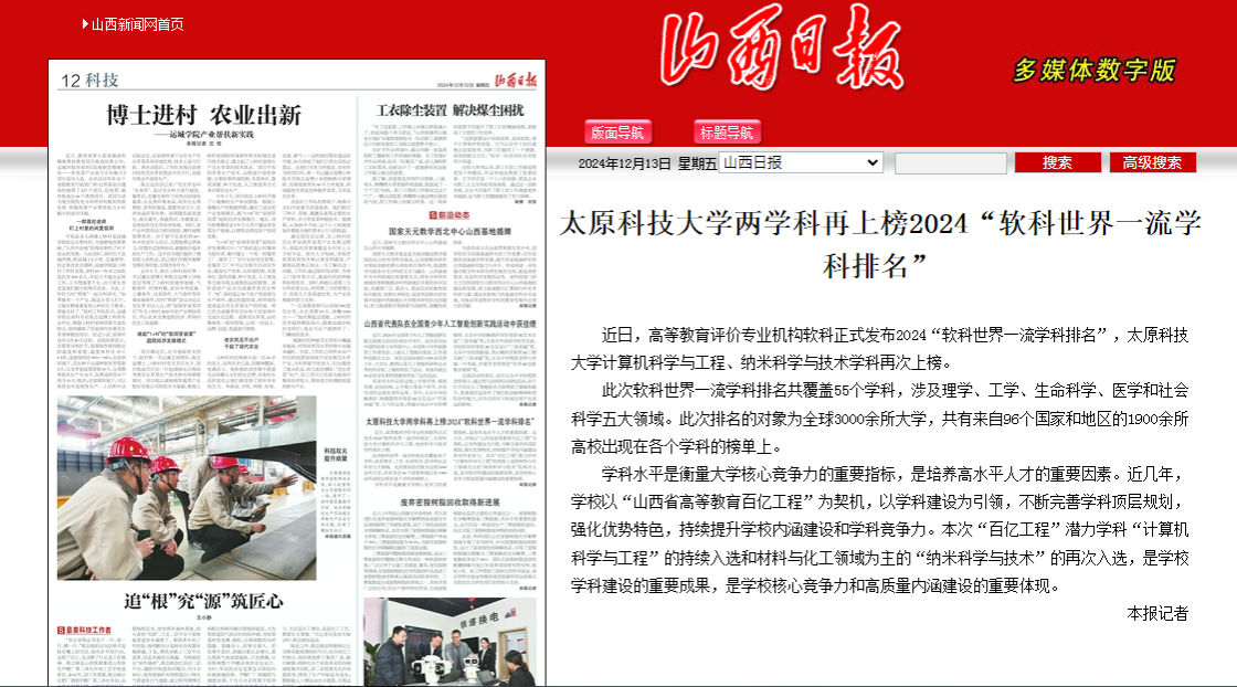 近日,高等教育评价专业机构软科正式发布2024“软科世界一流学科排名”,山西日报对beat365官网计算机科学与工程、纳米科学与技术学科再次上榜进行了报道。
