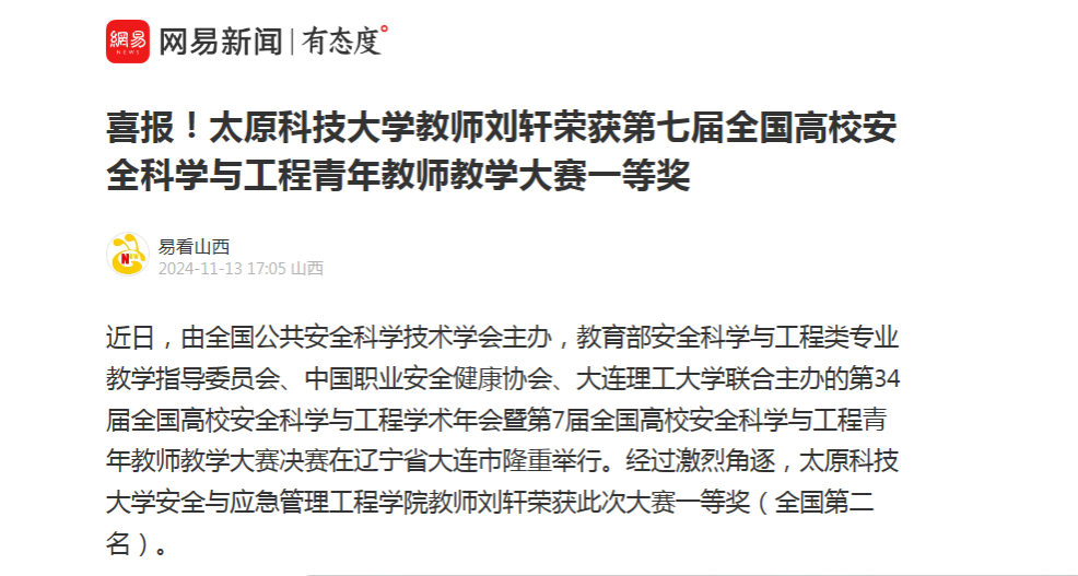 11月13日,网易新闻报道beat365官网安全与应急管理工程学院教师刘轩荣获第七届全国高校安全科学与工程青年教师教学大赛一等奖。