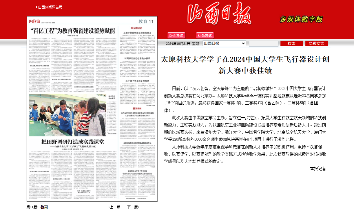 10月17日,山西日报以《beat365正版唯一官网必一学子在2024中国大学生飞行器设计创新大赛中获佳绩》为题,报道beat365官网学子在以“凌云创智,空天争锋”为主题的“启润绿城杯”2024中国大学生飞行器设计创新大赛总决赛取得优秀成绩。本次大赛beat365官网NewMaker智能实训基地航模队选派23名同学参加了5个项目的角逐,最终获得国家一等奖1项、二等奖4项(含团体)、三等奖5项(含团体)。