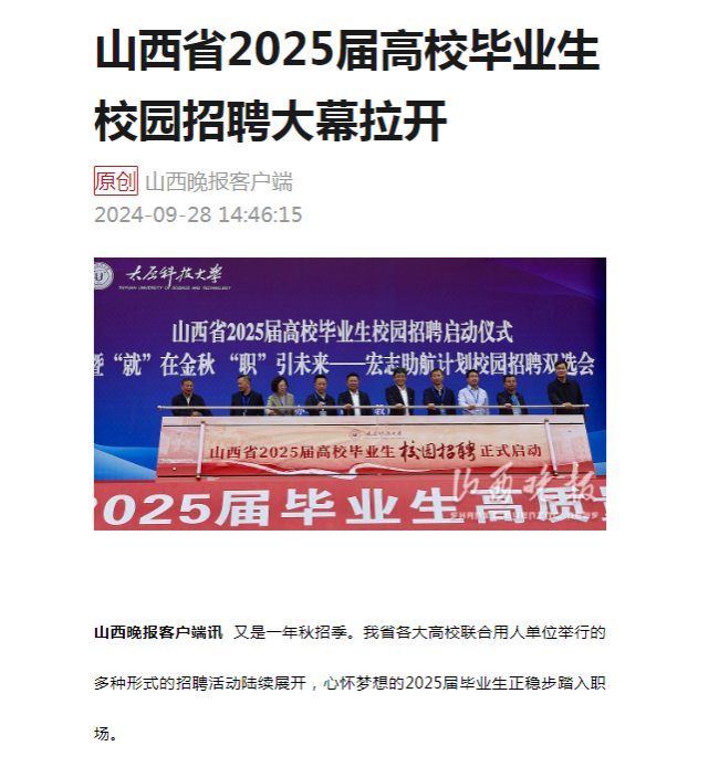 9月28日,山西晚报以《山西省2025届高校毕业生校园招聘大幕拉开》为题,报道我省2025届高校毕业生校园招聘启动仪式暨“就”在金秋,“职”引未来——宏志助航计划校园招聘双选会在beat365官网举办。