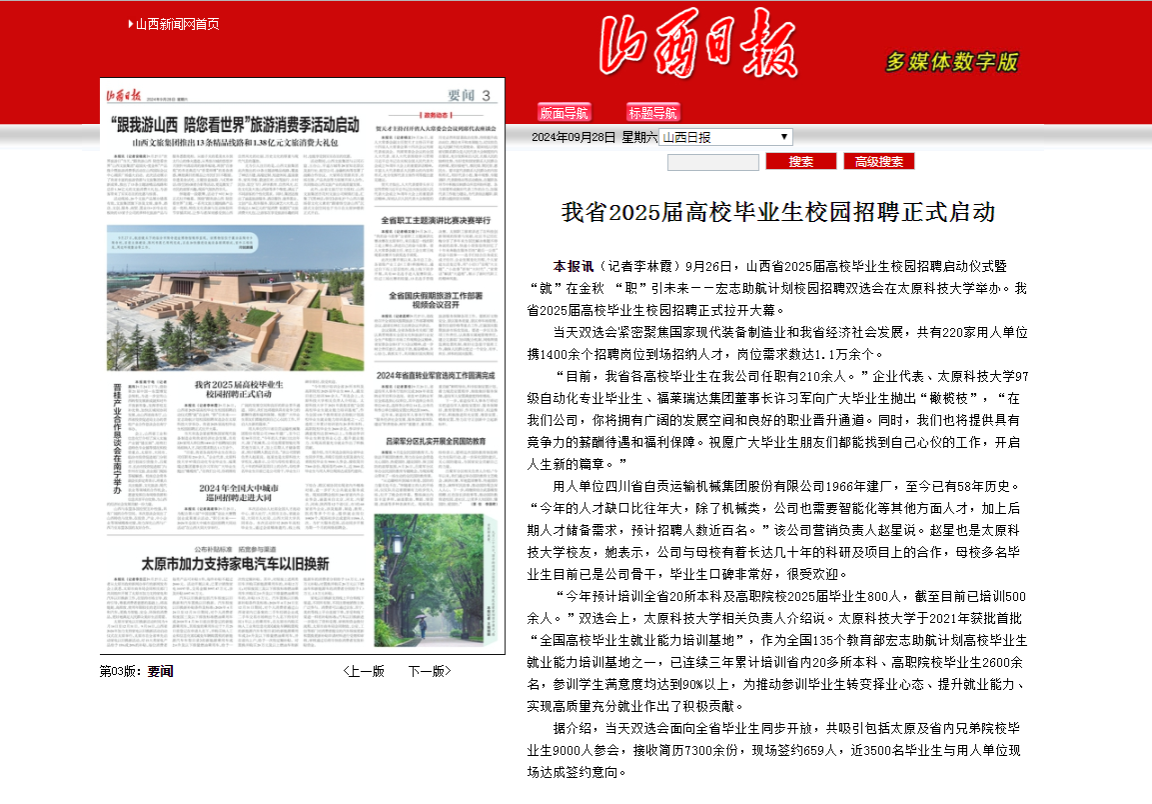 9月28日,山西日报以《我省2025届高校毕业生校园招聘正式启动》为题,报道山西省2025届高校毕业生校园招聘启动仪式暨“就”在金秋 “职”引未来——宏志助航计划校园招聘双选会在beat365官网举办。