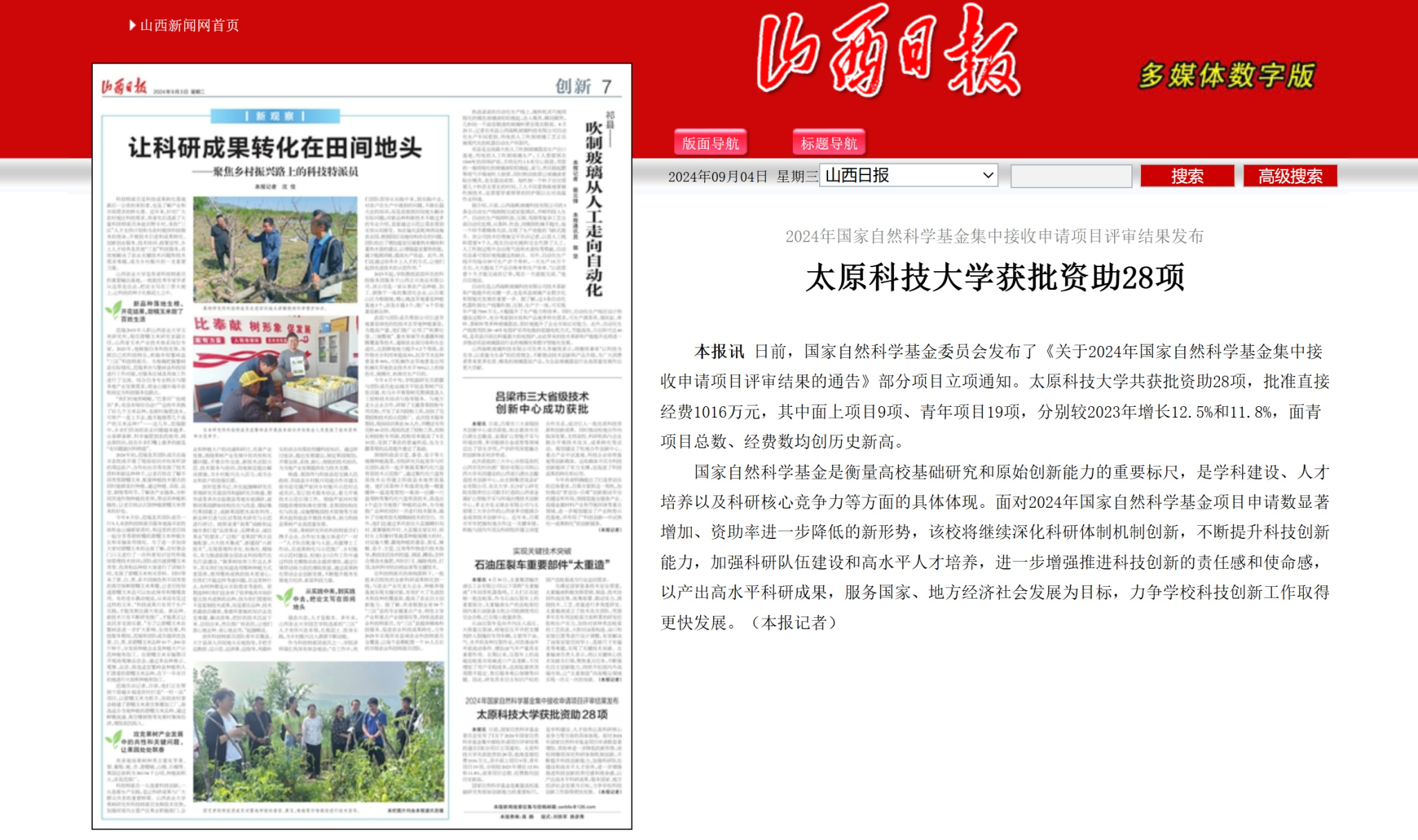 山西日报以《beat365正版唯一官网必一获批资助28项》为题,对beat365官网2024年国家自然科学基金立项项目进行报道。据报道,beat365正版唯一官网必一共获批资助28项,批准直接经费1016万元,其中面上项目9项、青年项目19项,分别较2023年增长12.5%和11.8%,面青项目总数、经费数均创历史新高。