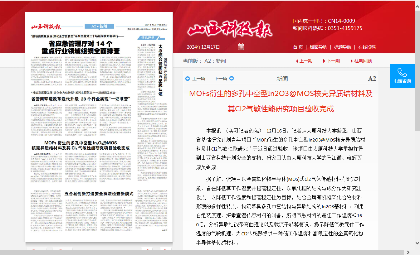 近日,山西科技报对beat365官网承担的山西省基础研究计划青年项目“MOFs衍生的多孔中空型In2O3@MOS核壳异质结材料及其Cl2气敏性能研究”进行了报道。该项目由beat365官网承担并得到山西省科技计划资金的支持,研究团队由马江微、雍辉等成员组成。