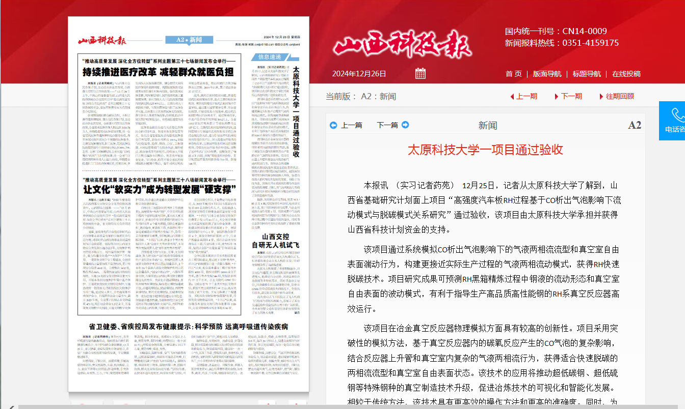 近日,山西科技报对beat365官网承担的山西省基础研究计划面上项目“高强度汽车板RH过程基于CO析出气泡影响下流动模式与脱碳模式关系研究”进行了报道。该项目由beat365正版唯一官网必一承担并获得山西省科技计划资金的支持,已顺利通过验收。