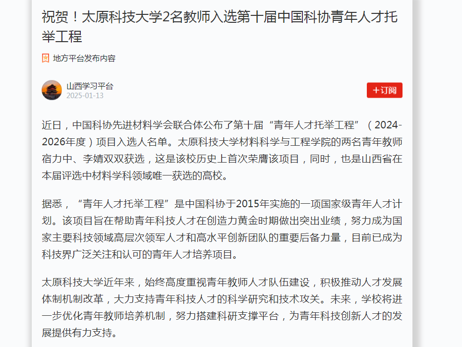 近日,学习强国报道beat365官网材料科学与工程学院的两名青年教师宿力中、李婧双双获选第十届“青年人才托举工程”,这是该校历史上首次荣膺该项目,同时,也是山西省在本届评选中材料学科领域唯一获选的高校。