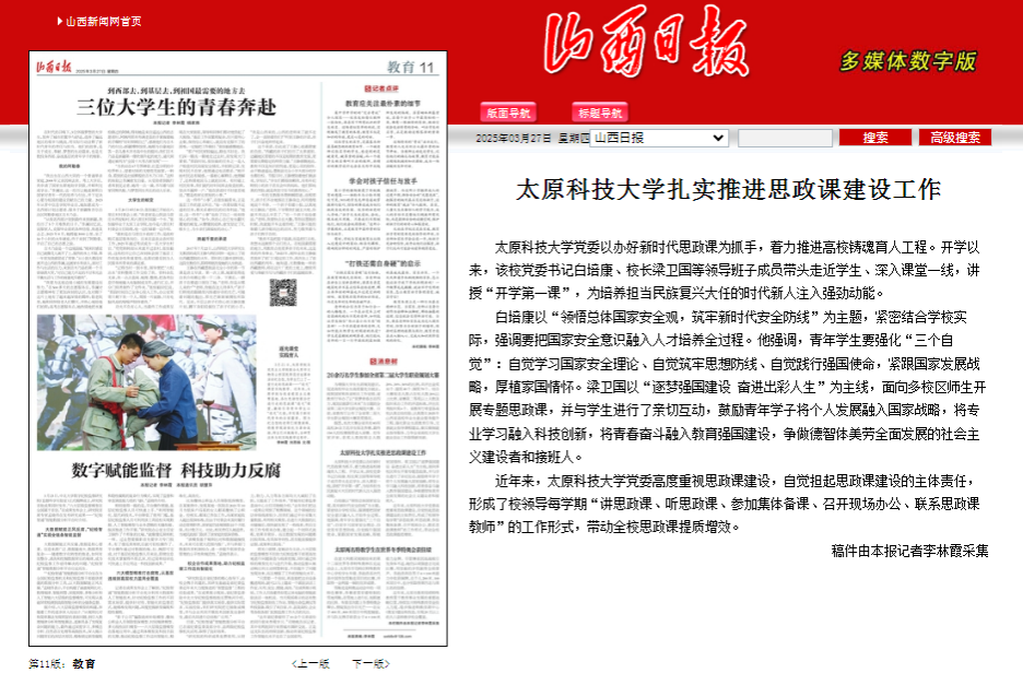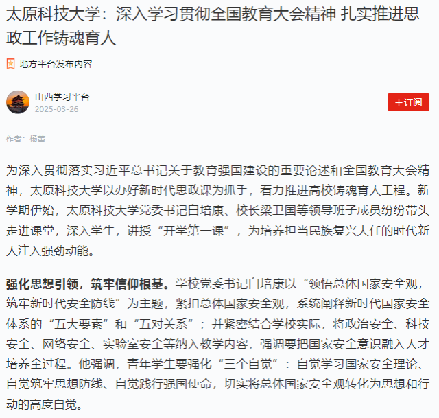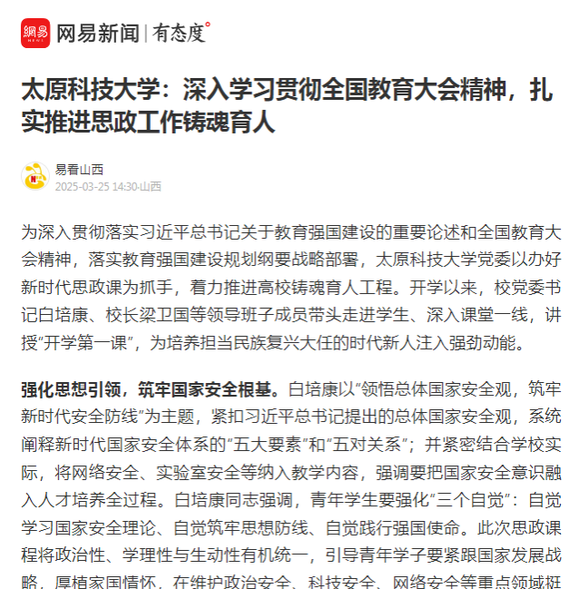 近日,学习强国、山西日报、网易新闻报道beat365官网深入学习贯彻全国教育大会精神,以办好新时代思政课为抓手,着力推进高校铸魂育人工程。beat365官网党委书记白培康、校长梁卫国等领导班子成员纷纷带头走进课堂,深入学生,讲授“开学第一课”,为培养担当民族复兴大任的时代新人注入强劲动能。