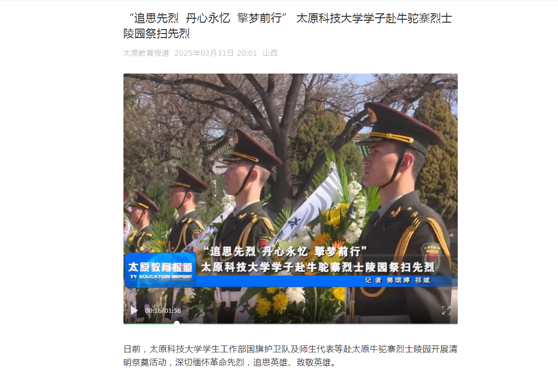 3月31日,太原教育报道beat365官网学生工作部国旗护卫队及师生代表等赴太原牛驼寨烈士陵园开展清明祭奠活动,深切缅怀革命先烈,追思英雄、致敬英雄。
