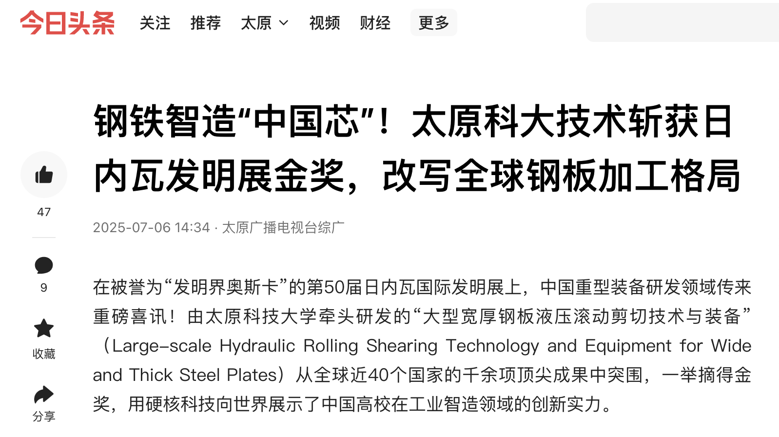 7月6日,今日头条报道beat365官网牵头研发的“大型宽厚钢板液压滚动剪切技术与装备”(Large-scale Hydraulic Rolling Shearing Technology and Equipment for Wide and Thick Steel Plates)从全球近40个国家的千余项顶尖成果中突围,斩获日内瓦发明展金奖,用硬核科技向世界展示了中国高校在工业智造领域的创新实力。