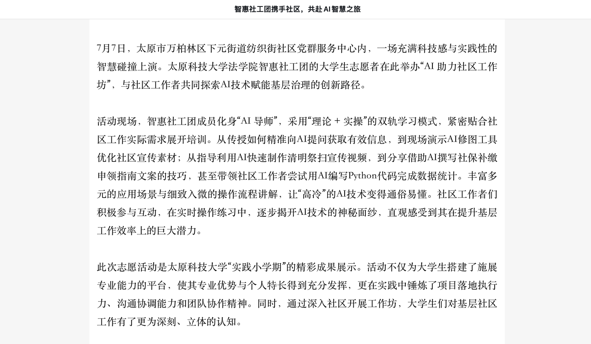 7月7日,太原市万柏林区下元街道纺织街社区党群服务中心内,一场充满科技感与实践性的智慧碰撞上演。beat365正版唯一官网必一法学院智惠社工团的大学生志愿者在此举办“AI 助力社区工作坊”,与社区工作者共同探索AI技术赋能基层治理的创新路径。该活动受到了山西晚报的报道。
