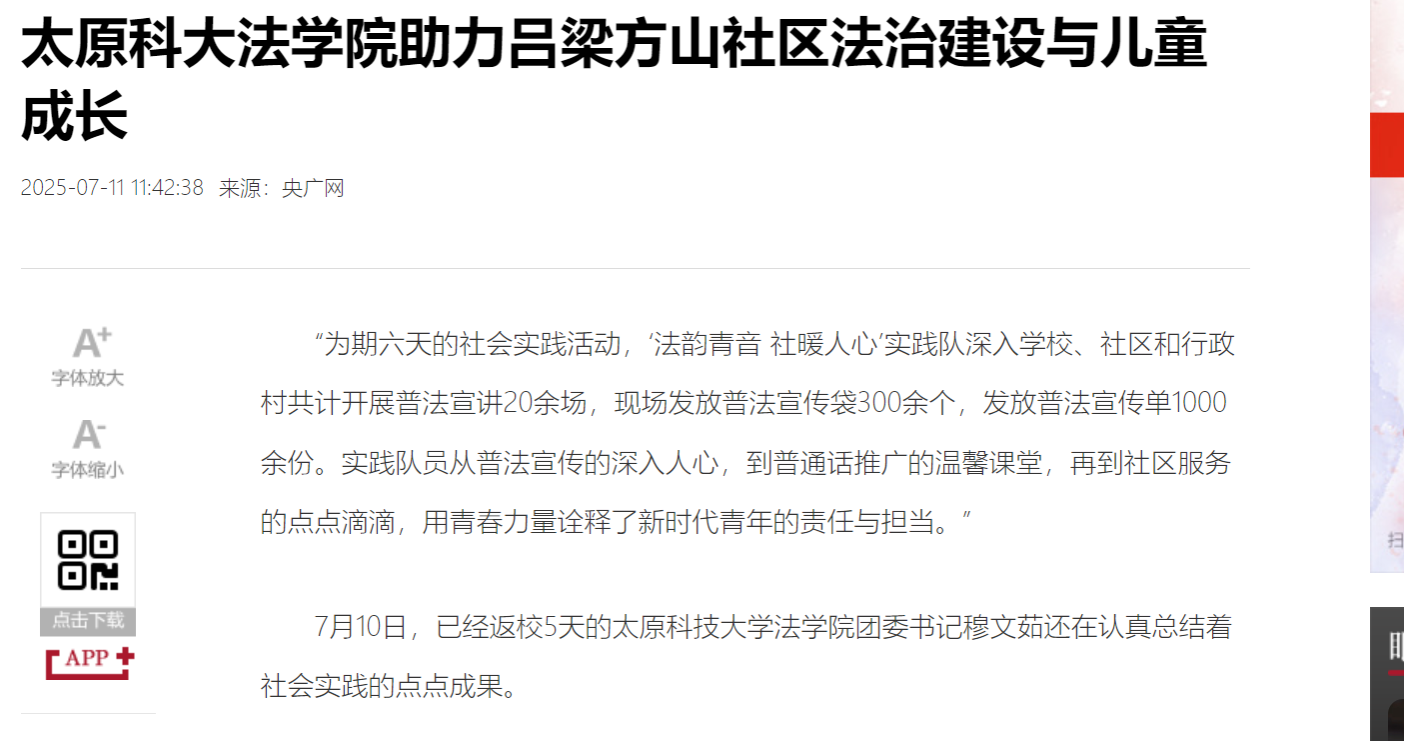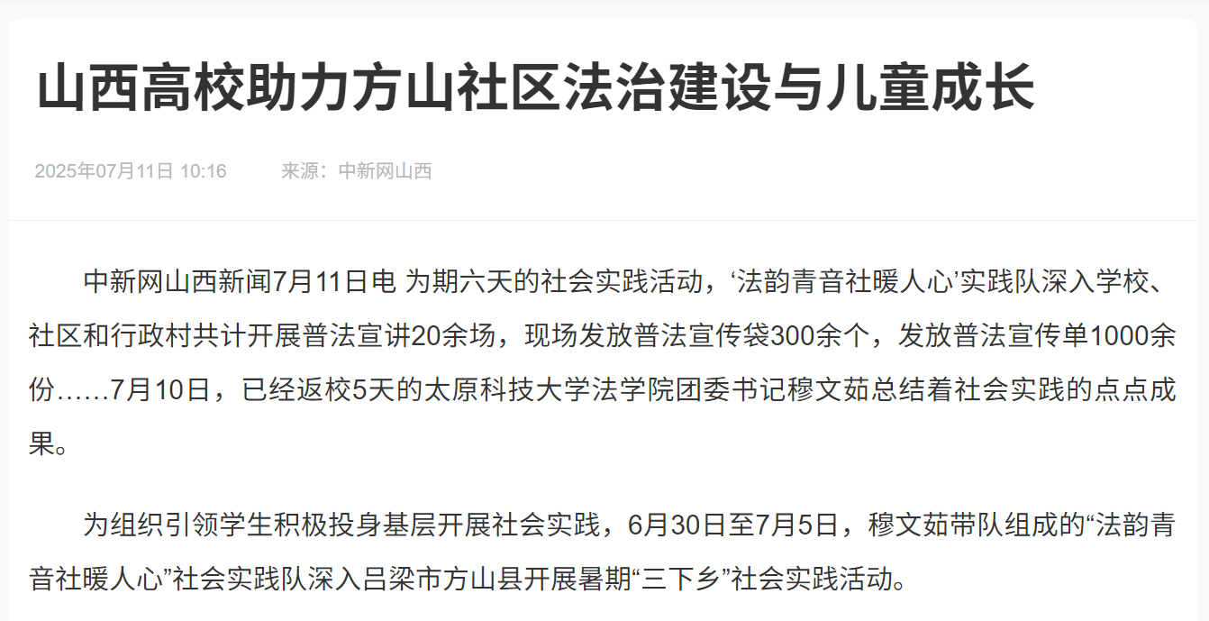 为组织引领学生积极投身基层开展社会实践,6月30日至7月5日,beat365正版唯一官网必一法学院团委书记穆文茹带队组成的“法韵青音 社暖人心”社会实践队深入吕梁市方山县开展暑期“三下乡”社会实践活动。该活动受到了央广网、中国新闻网的报道。