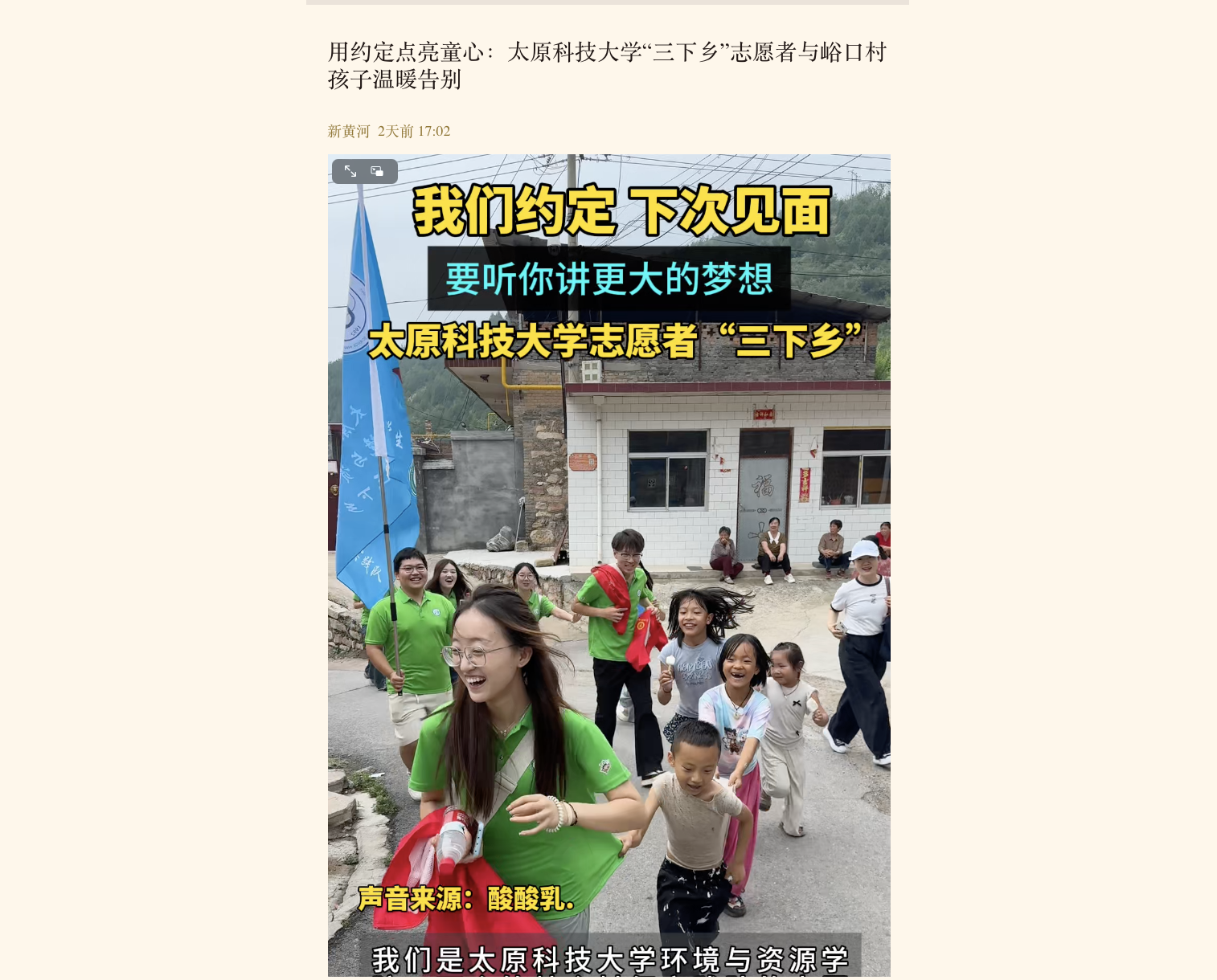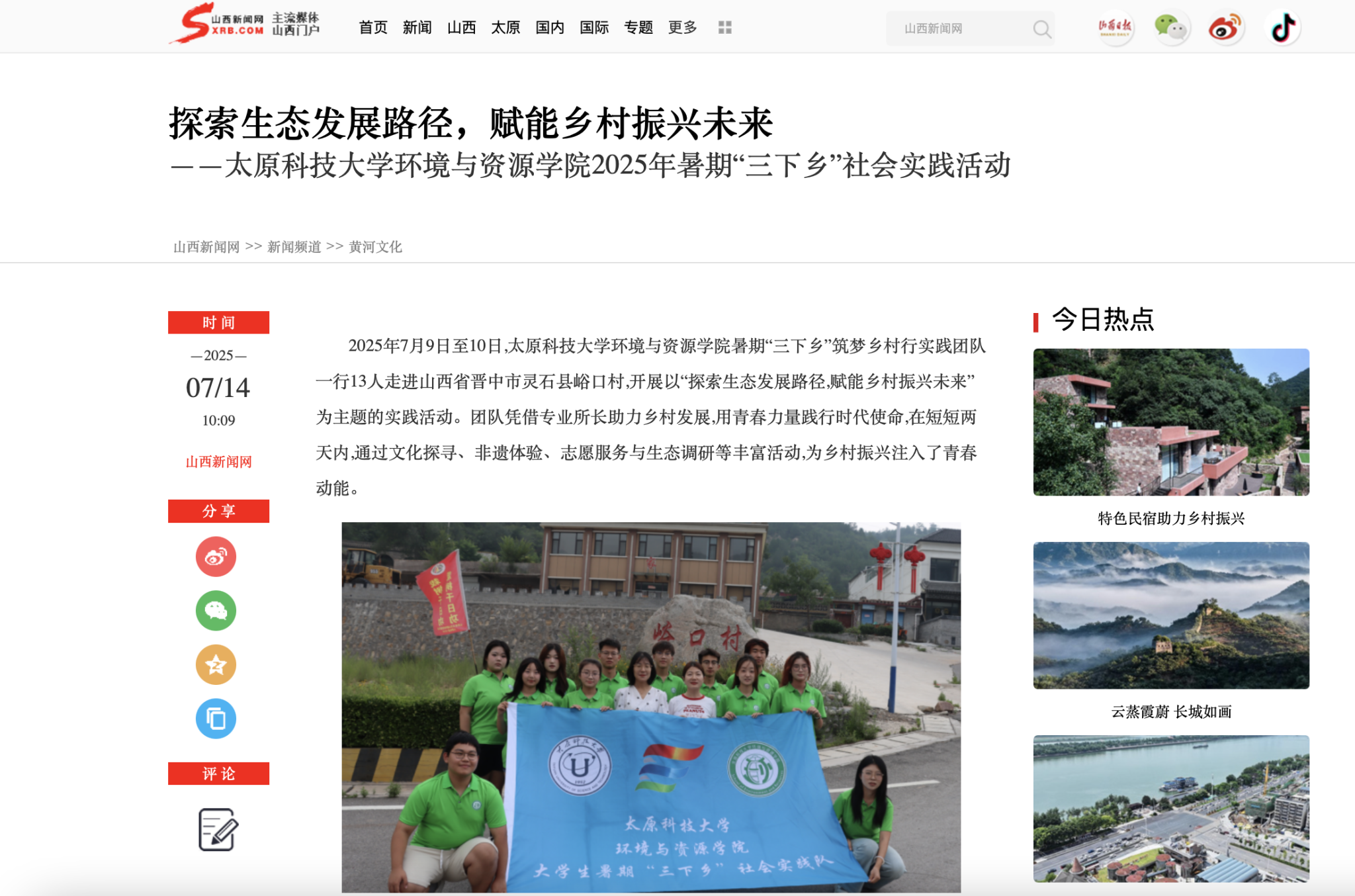 7月14日,山西新闻网报道beat365官网环境与资源学院暑期“三下乡”筑梦乡村行实践团队一行13人走进山西省晋中市灵石县峪口村,开展以“探索生态发展路径,赋能乡村振兴未来”为主题的实践活动。团队凭借专业所长助力乡村发展,用青春力量践行时代使命,通过文化探寻、非遗体验、志愿服务与生态调研等丰富活动,为乡村振兴注入了青春动能。