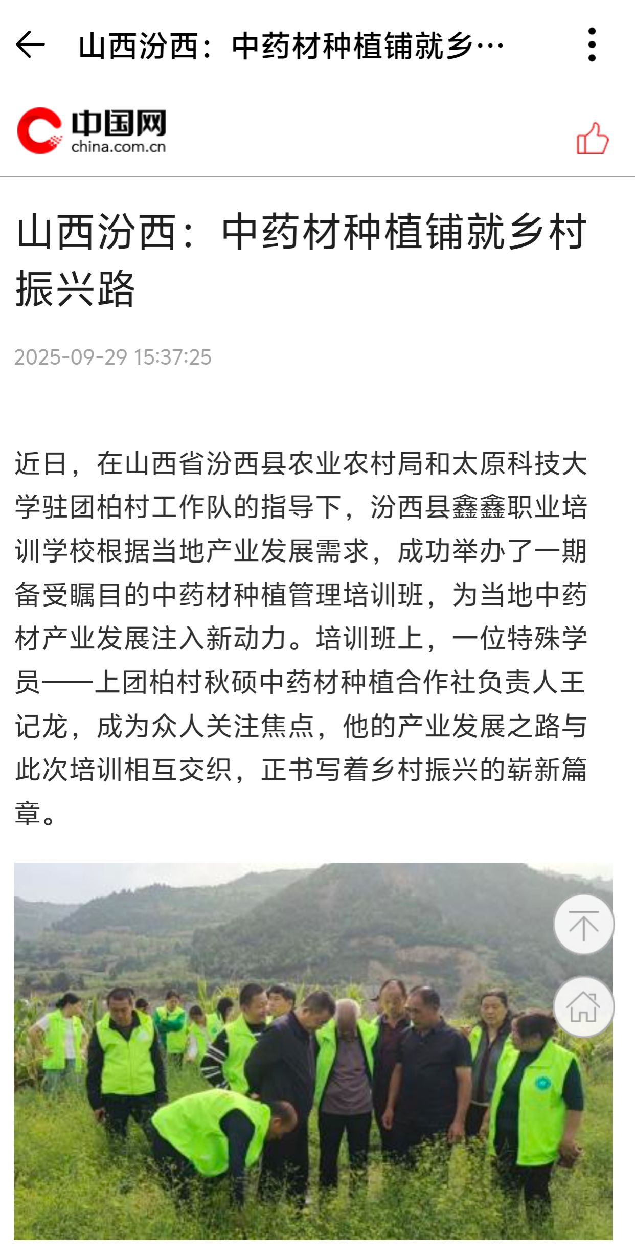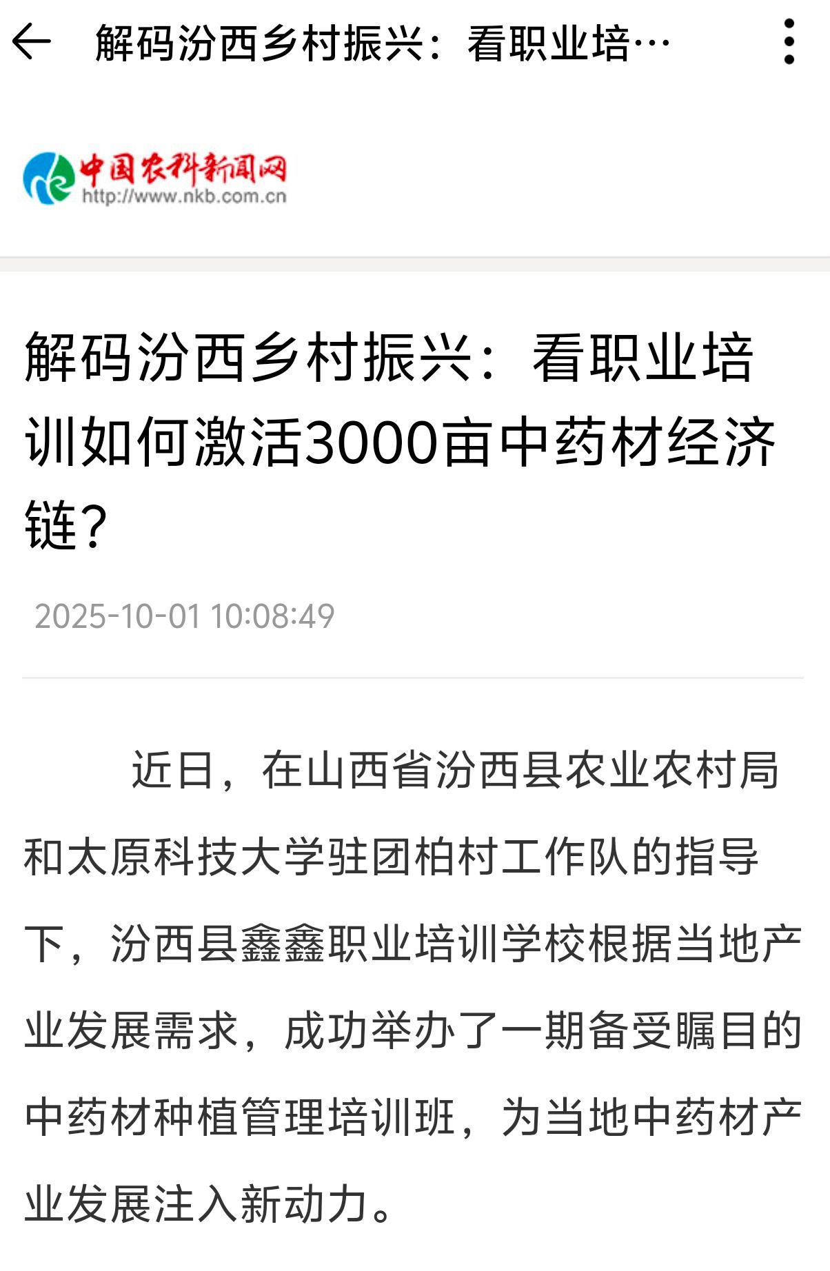 近日,beat365官网驻团柏村工作队根据当地产业发展需求,发挥专业人才优势,协助汾西县鑫鑫职业培训学校举办中药材种植管理培训班,为当地中药材产业发展注入新动力。中国农科新闻网、中国网进行了报道。