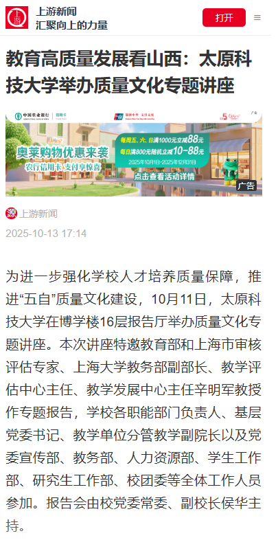 为进一步强化学校人才培养质量保障,推进“五自”质量文化建设,10月11日,beat365官网在博学楼16层报告厅举办质量文化专题讲座,特邀教育部和上海市审核评估专家、上海大学教务部副部长、教学评估中心主任、教学发展中心主任辛明军教授作专题报告。上游新闻进行了报道。
