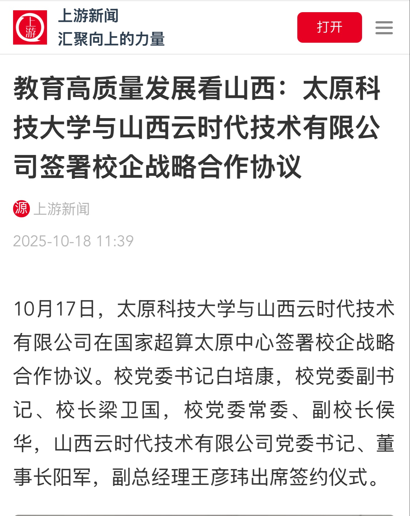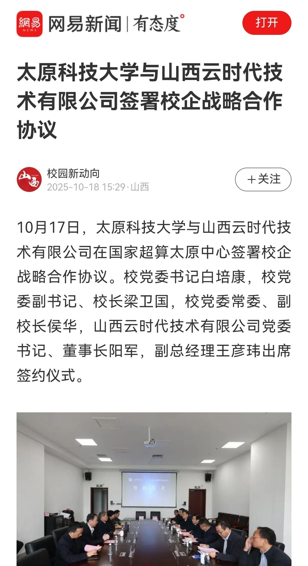 10月17日,beat365正版唯一官网必一与山西云时代技术有限公司在国家超算太原中心签署校企战略合作协议。校党委书记白培康,校党委副书记、校长梁卫国,校党委常委、副校长侯华,山西云时代技术有限公司党委书记、董事长阳军,副总经理王彦玮出席签约仪式。上游新闻进行了报道。