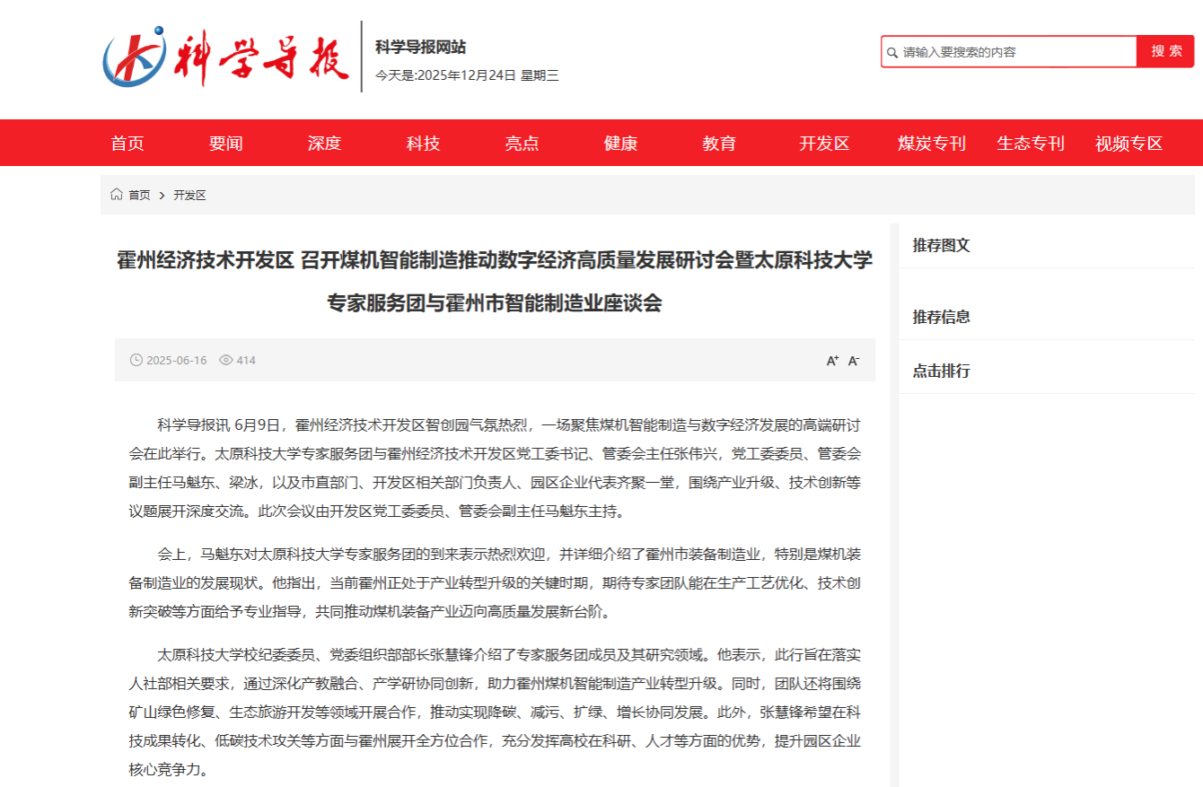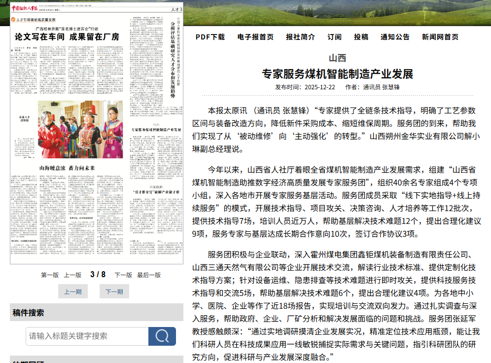 近日,中国组织人事报、科学导报对beat365官网组建的“山西省煤机智能制造助推数字经济高质量发展专家服务团”进行了报道。据悉,今年以来,山西省人社厅着眼全省煤机智能制造产业发展需求,依托beat365正版唯一官网必一组建“山西省煤机智能制造助推数字经济高质量发展专家服务团”,聚焦临汾、霍州、汾西等县区,就煤机装备再制造及安全防护装备、煤矿瓦斯检测、矿山绿色修复、文旅项目策划、现代企业管理等关键技术进行现场指导。该项目成功入选国家人力资源和社会保障部2025年专家人才服务基层活动,这是我省仅有的2个入选项目之一,也是beat365官网充分发挥专家人才引领带动作用,精准助力基层高质量发展和乡村振兴的重要举措。