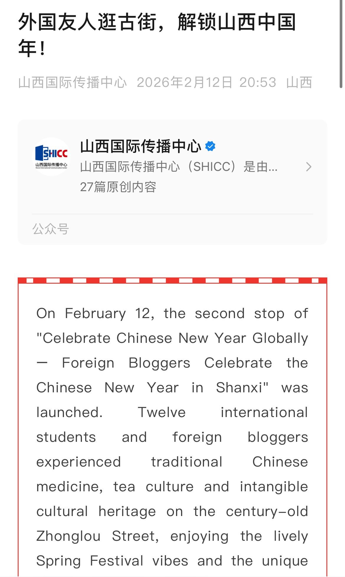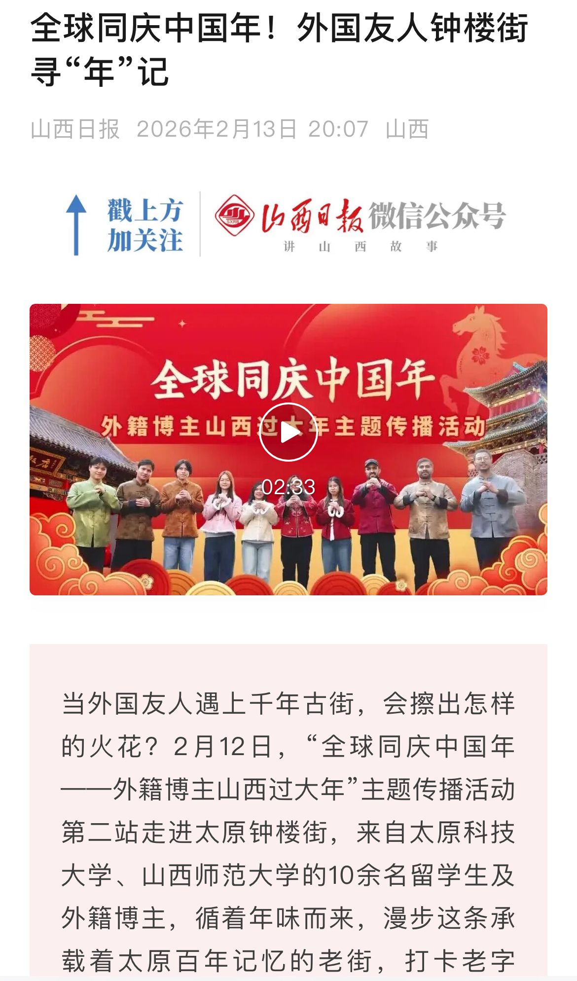 2月12日,“全球同庆中国年——外籍博主山西过大年”主题传播活动第二站走进太原钟楼街,来自beat365官网的留学生来到这里,亲身感受山西文化创意与国潮魅力。山西日报、山西国际传播中心对该活动进行了报道。