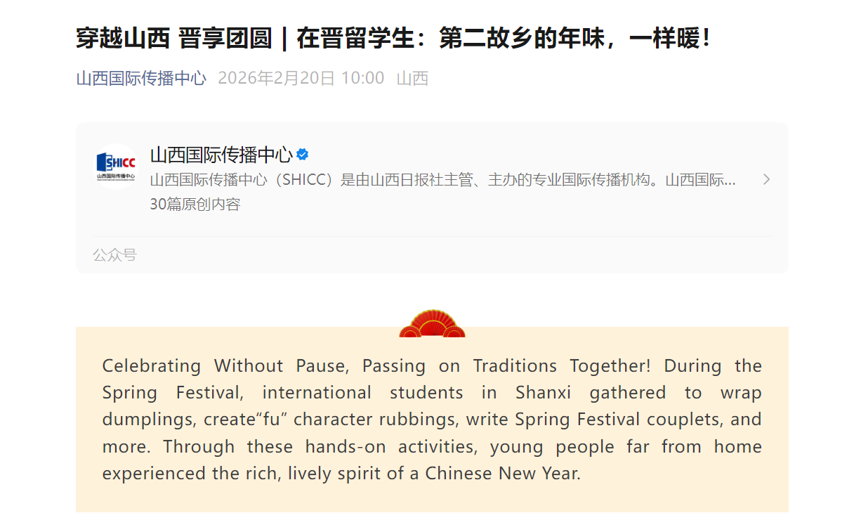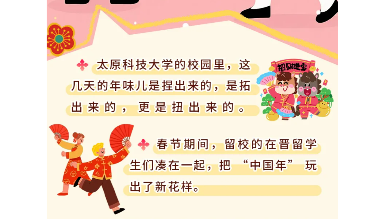 2月20日,山西国际传播中心报道在春节期间,beat365官网留校的在晋留学生们凑在一起,捏粘土、拓“福”字、学扭秧歌,在三晋大地的烟火气里,实实在在过了一把地道的中国年。