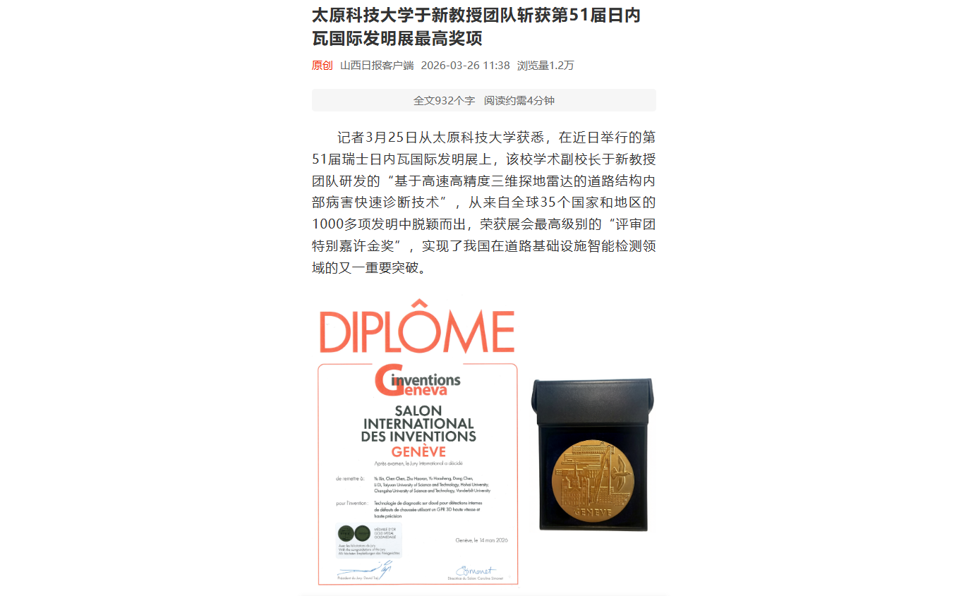 在近日举行的第51届瑞士日内瓦国际发明展上,beat365官网学术副校长于新教授团队研发的“基于高速高精度三维探地雷达的道路结构内部病害快速诊断技术”,从来自全球35个国家和地区的1000多项发明中脱颖而出,荣获展会最高级别的“评审团特别嘉许金奖”,实现了我国在道路基础设施智能检测领域的又一重要突破。山西日报对此进行了报道。
